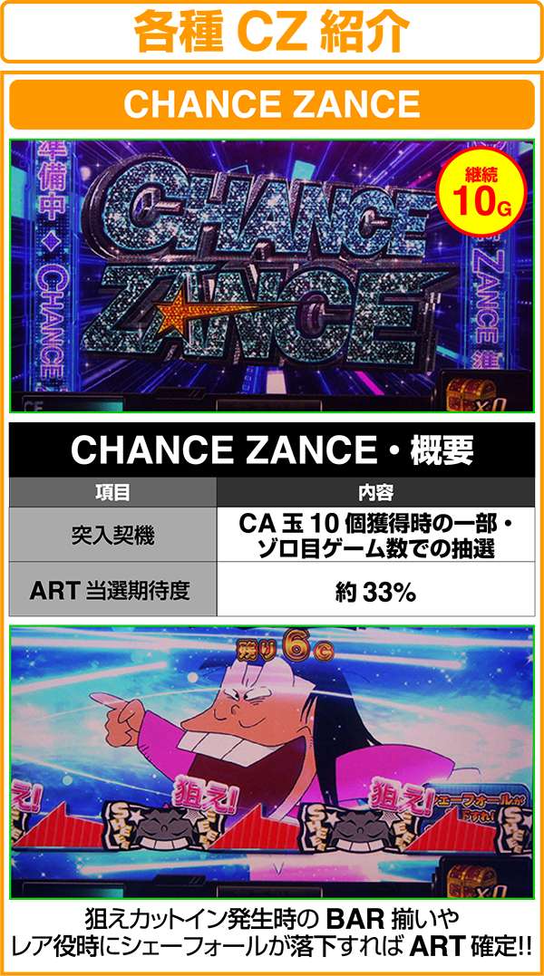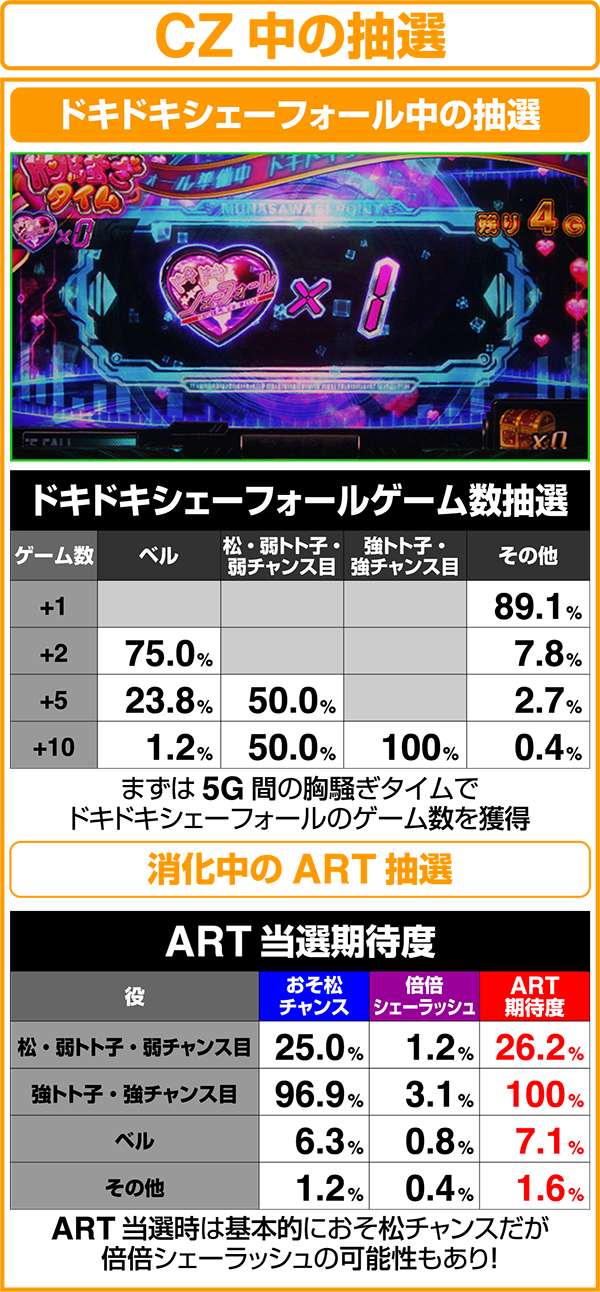 2ポイント以下でもドキドキシェーフォール(CZ)のチャンスがあり、CZに非当選でもCZ当選に関わる裏モードや高確上乗せモードのアップ抽選をおこなっている。