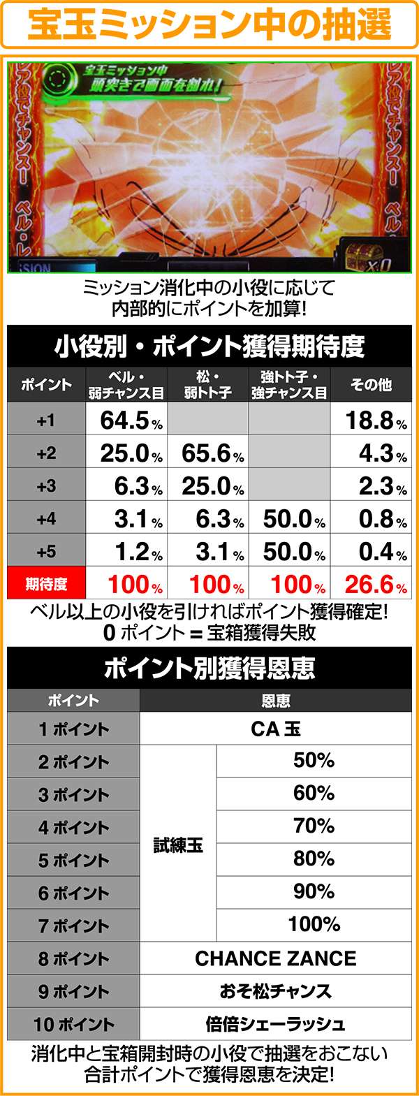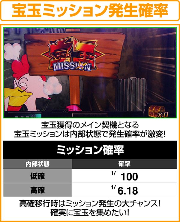また、宝玉ミッションで宝箱を獲得した次のゲームにレア役が成立した場合は、ART直撃の可能性がある。