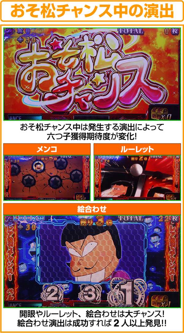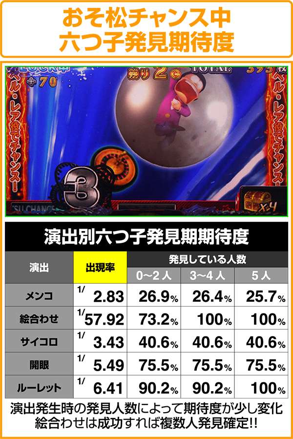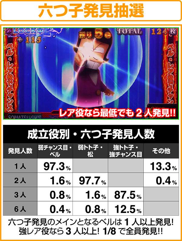 6G間で4人見つけられれば、少なくともおそ松チャンスの継続は確定。つまり、ベルのみでも4回でOK。レア役が1回でも絡めば、継続以上の可能性はぐっと高まる。
