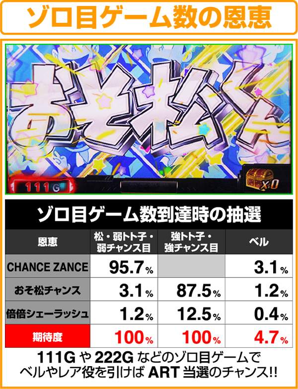 宝玉が貯まっている時はもちろん、ゾロゲーム数は最低でも宝玉を獲得、CZやART当選のチャンスでもあるため、狙い目だ。とくに、111G、333G、666Gは各種抽選が優遇されているぞ。