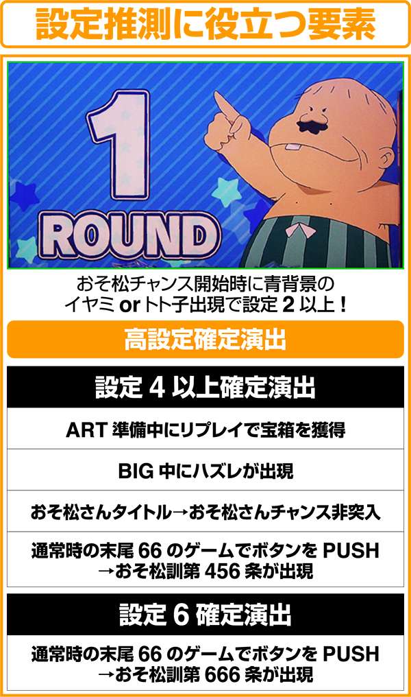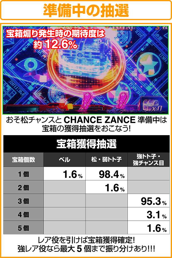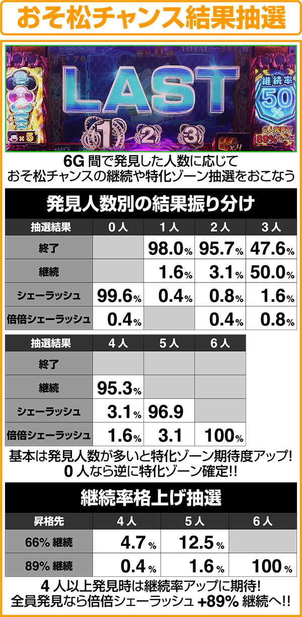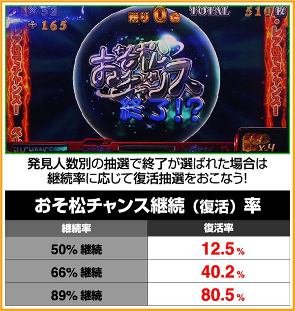 4人&5人発見時は継続以上が確定となるだけでなく、おそ松チャンス自体の継続率アップ抽選をおこなっている。
