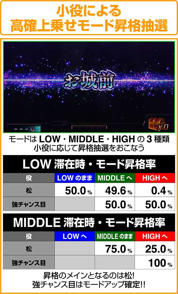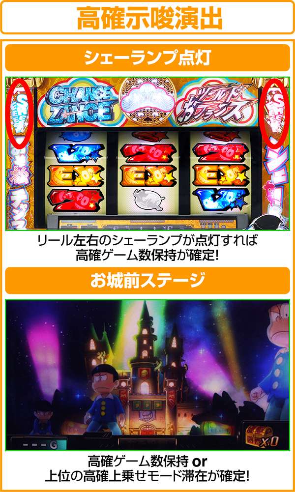 高確中なら約1/6で発生となるため、高確濃厚となるお城前に移行した場合は、毎レバーに気合いを込めよう。