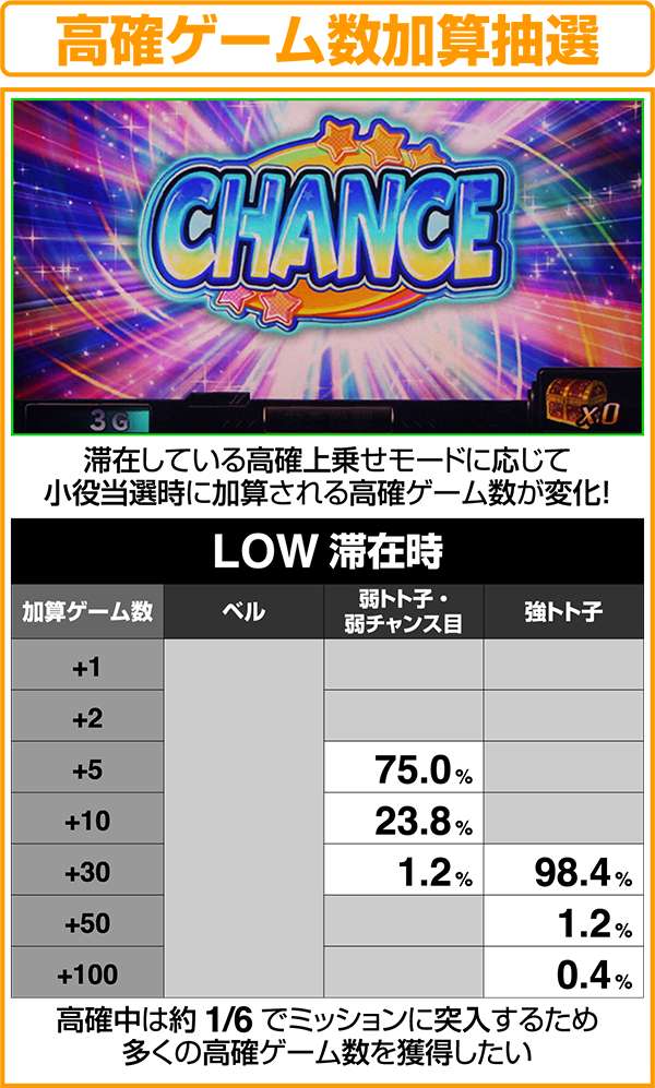モードによって小役当選時に獲得できる高確ゲーム数に差があるため、上位のモードほど高確期待度がアップ=ミッション当選率もアップといった仕組みだ。
