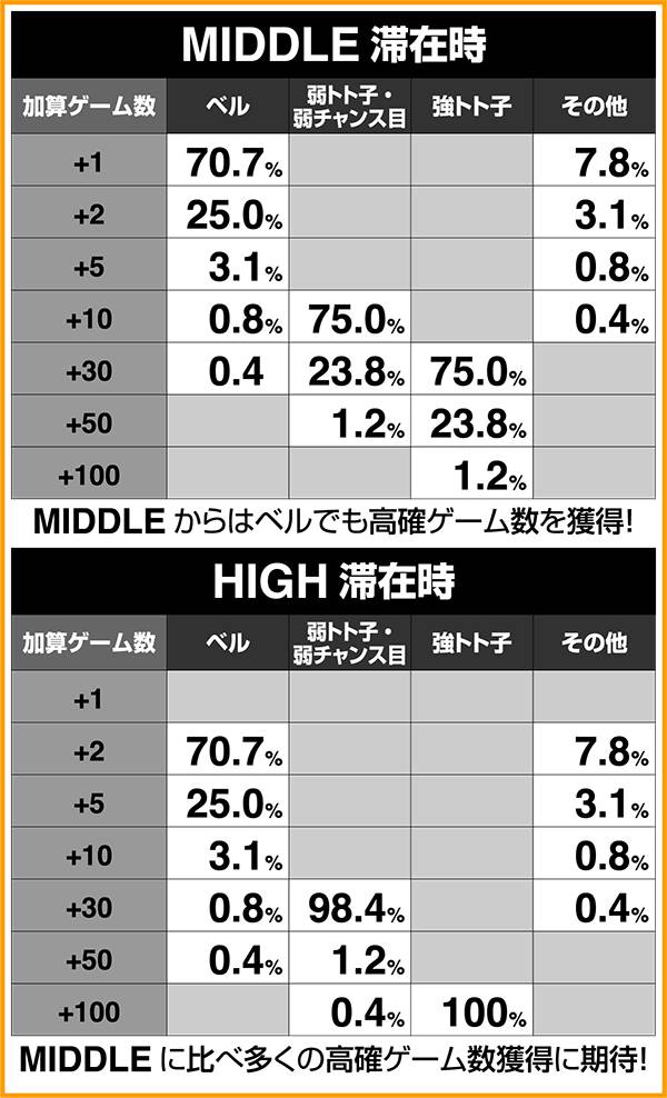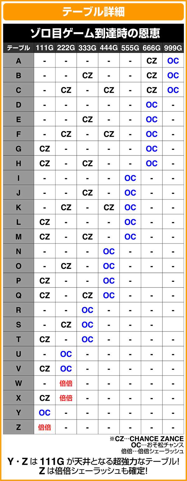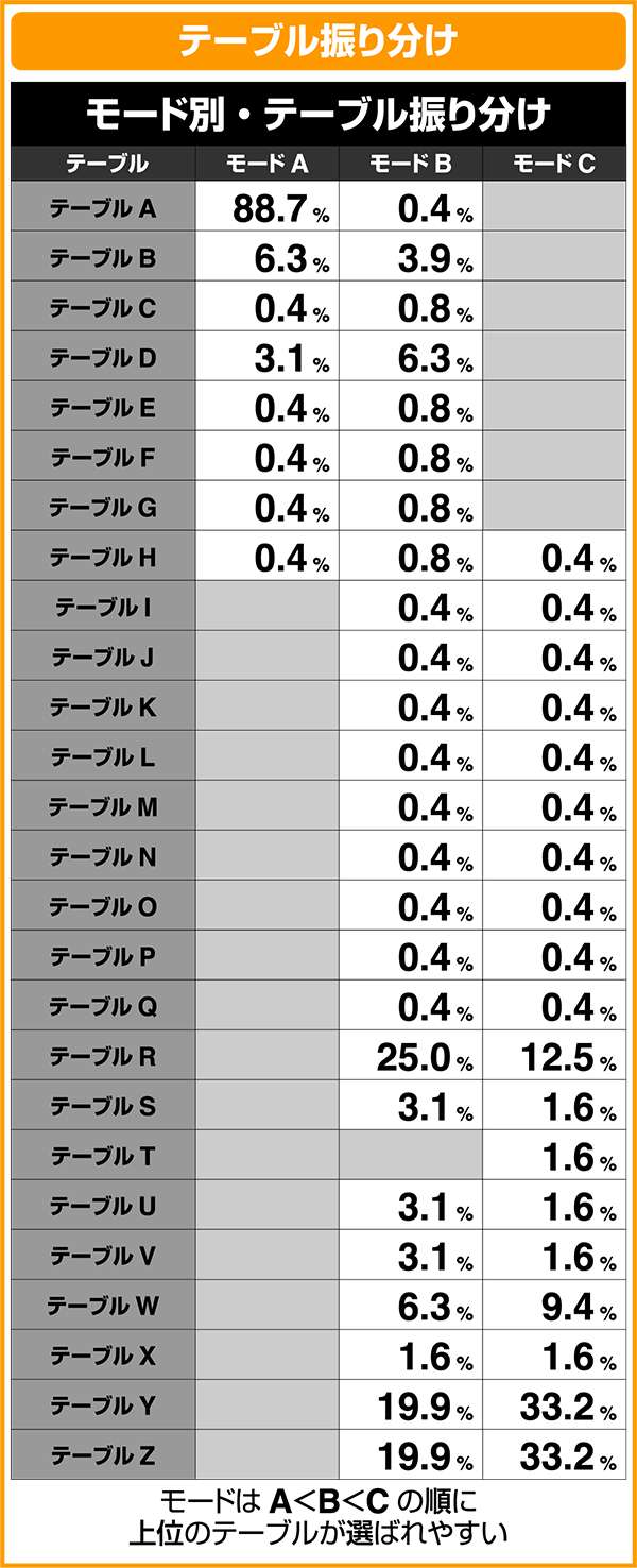 モードCは111Gが天井となるテーブルYとZの選択率が約66%もある強力なテーブル。さらに、約80%でループするため、1度選ばれてしまえば同一モードをロングループする可能性も十分にある魅力的なモードとなっている。