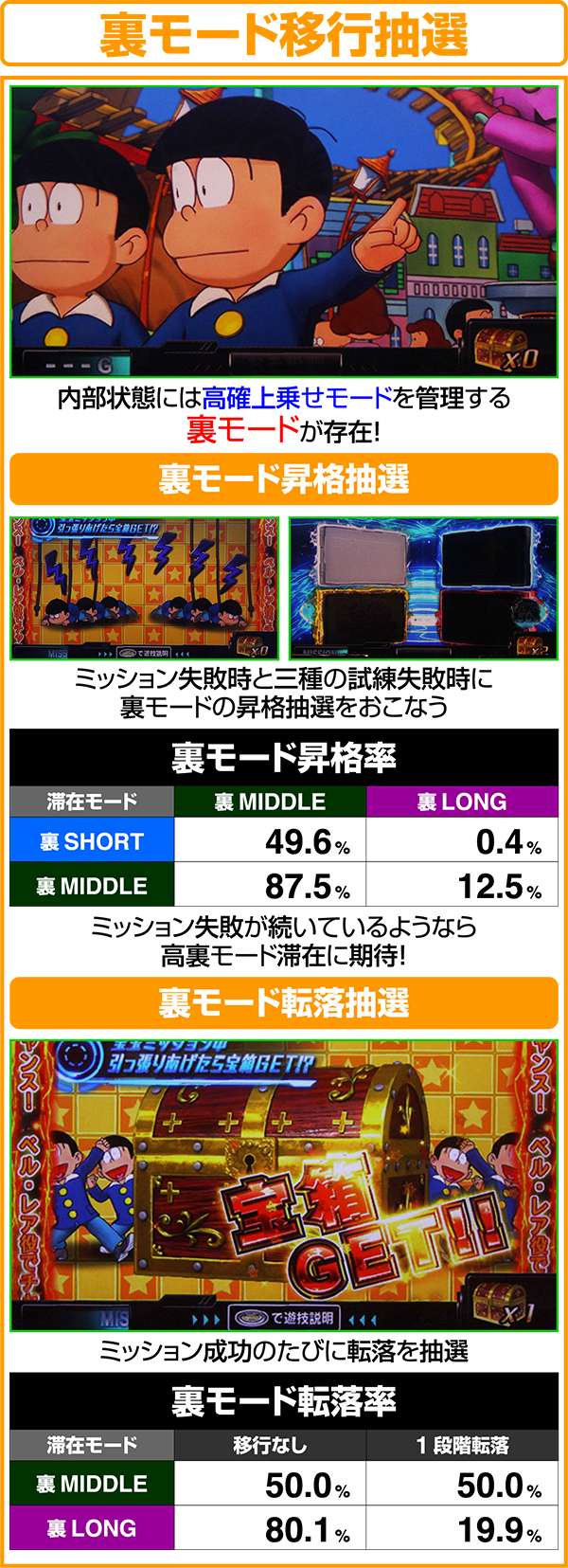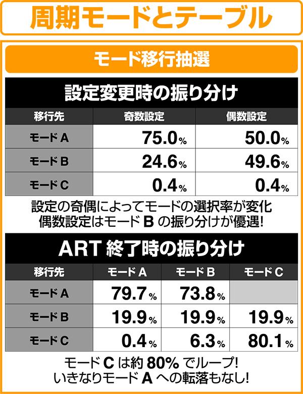 内部状態には、高確上乗せモードを管理する裏モードというものも存在。裏モードが高いほど高確上乗せモードが転落しにくいため、結果的にミッションの発生やCZ、ARTの当選に期待が持てるといった仕組みとなっている。