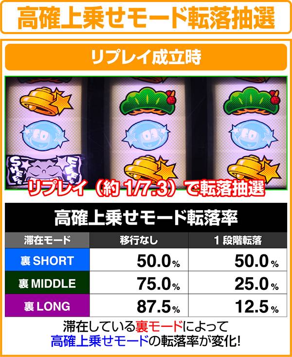 滞在している裏モードに応じて、リプレイ成立時に高確上乗せモードの転落抽選をおこなう。