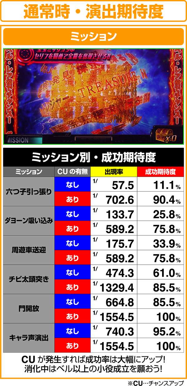 上表の数値はあくまでも演出そのものの成功期待度。ベル以上の小役を引いた場合は成功が確定するため、期待度の低いミッションや試練でも成功の可能性は十分にある。