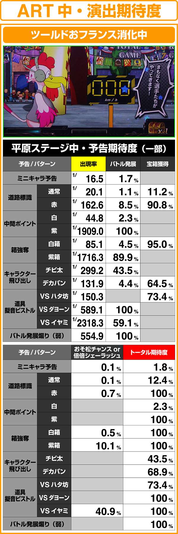 発見人数による抽選は継続率不問でおこなわれるが、非継続時の復活抽選は継続率が高いほど優遇されている。89%継続なら約80%で継続となるため、ツールドおフランスへ移行する前から十分な出玉やゲーム数の獲得に期待できる。