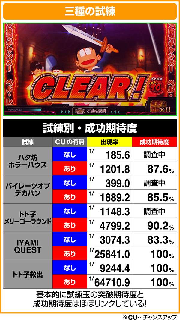 仮に試練玉2個を内部的に持っていた場合、見た目上は0スタートだが、1つ獲得した時点で三種の試練が発動する。このため、試練玉やCA玉の獲得個数などがズレてCZやARTが発動したり、数十ゲームしか回していない状態でゲーム数がズレていた場合でも、据え置き確定となるわけではない。