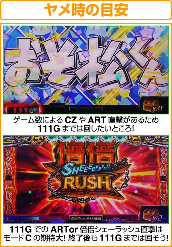 また、111GでARTもしくは倍倍シェーラッシュに当選した場合はモードCの期待度が大幅にアップ。モードCは約80%でループするため、確認した場合は最低でも111Gまでは回そう。余裕があれば333Gまで回しておくと、モードBとCで振り分けの多いART直撃までしっかりとフォローできる。