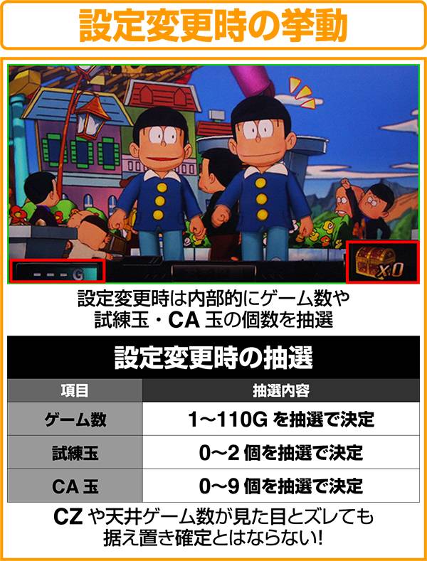 設定変更時はゲーム数と試練玉、CA玉がそれぞれ抽選され、内部的に見た目よりも多い状態からスタート。