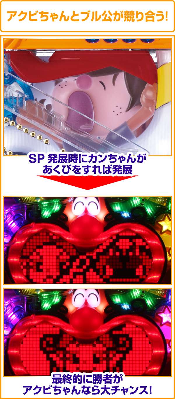 競り合い演出が4回発生し、1回でもアクビちゃんが優勢ならチャンス。最終的に勝者がアクビちゃんならアツく、ブル公でもチャンスとなる。