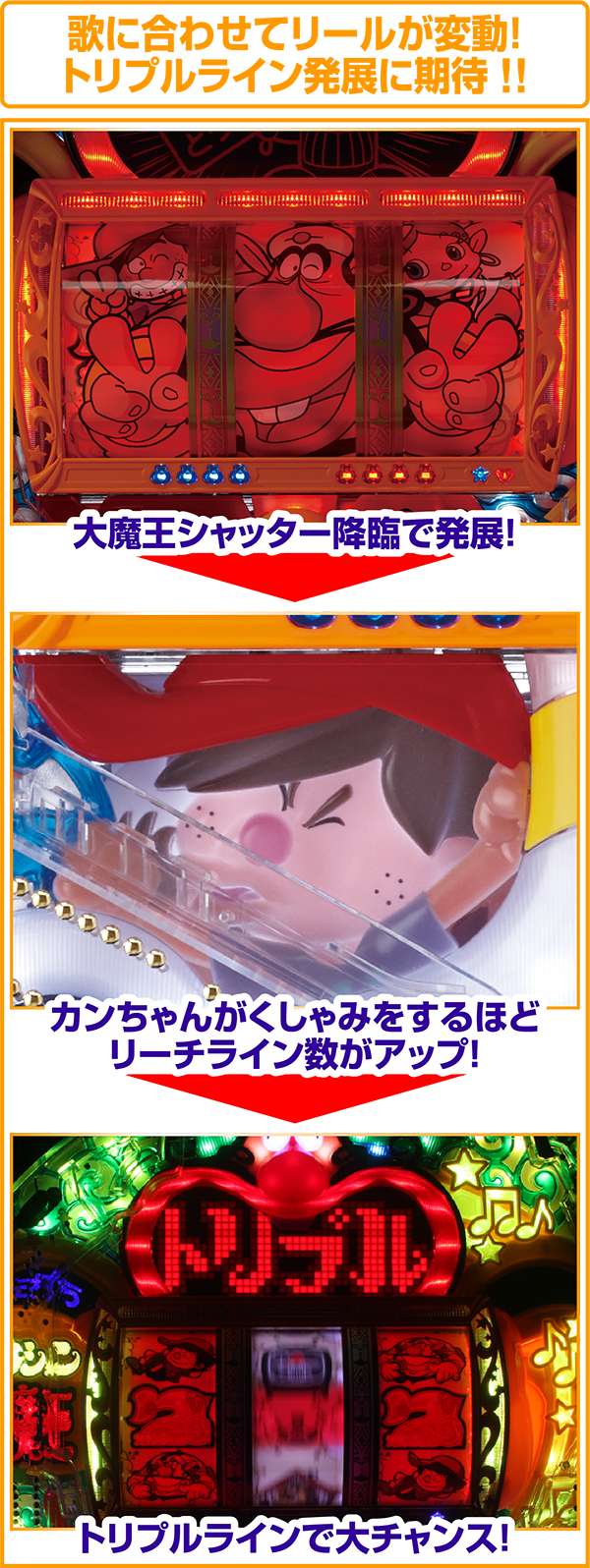 リーチ中にカンちゃんがくしゃみをするたび、ライン数がシングル→ダブル→トリプルへとアップする。