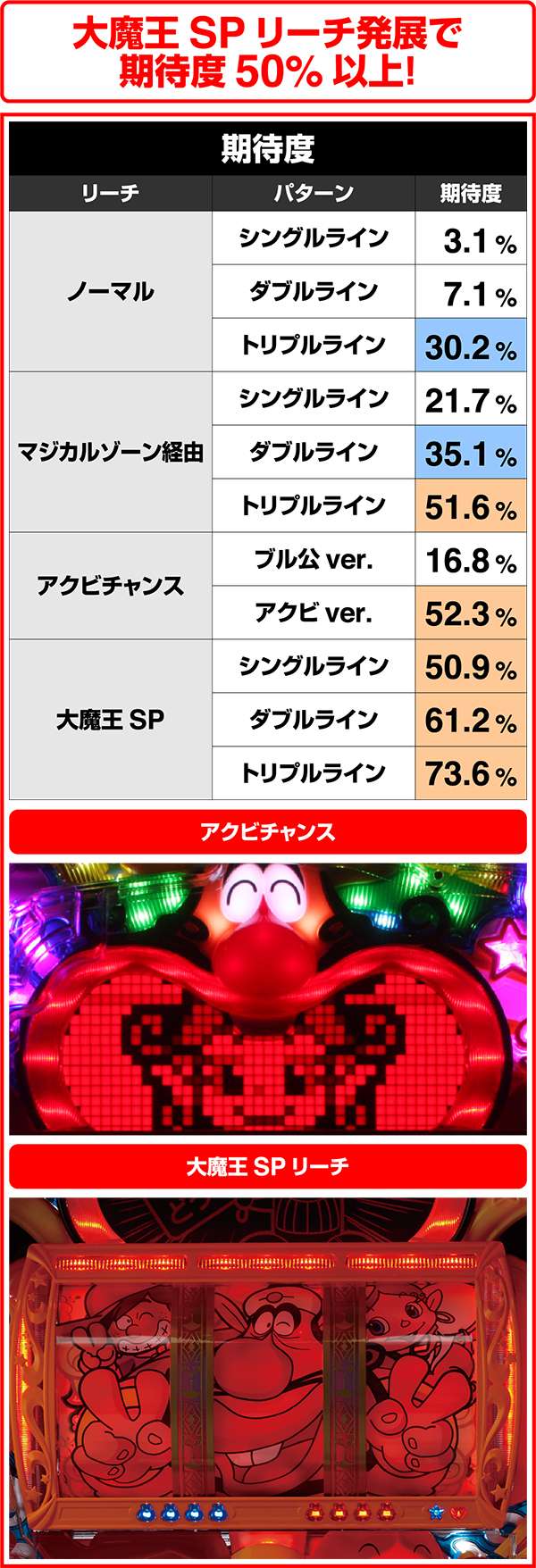 ノーマルリーチでもトリプルラインなら期待度30.2%と大チャンス。 大魔王SPリーチは発展すれば期待度50%以上となり、トリプルラインに発展で期待度73.6%と激アツ!