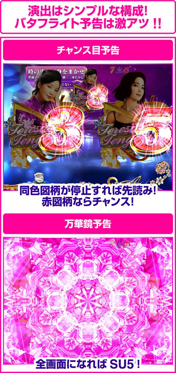 アジアの歌姫、テレサ・テンの魅力がココに集結。 スペックは初心者でも遊びやすいミドルの確変ループタイプとなっている。 全15曲の懐かしの名曲を収録、音と光がリンクするフルオーケストラシステムなど、液晶以外でもファンを楽しませる仕掛けがたくさん用意されているぞ。 |