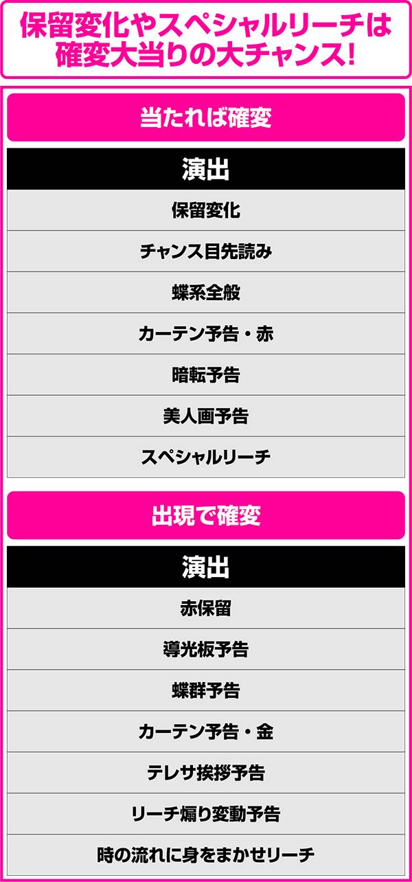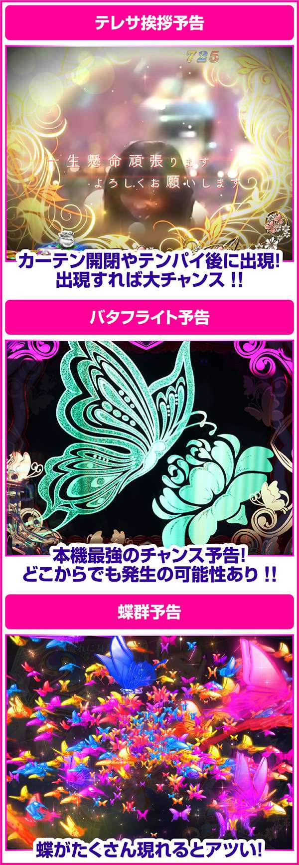 変動中に蝶が1匹で出現すると保留変化やチャンス目発生のチャンス。蝶が保留に止まれば色が変化し、図柄を横切ればチャンス目が停止!? 保留は赤ならアツいぞ!