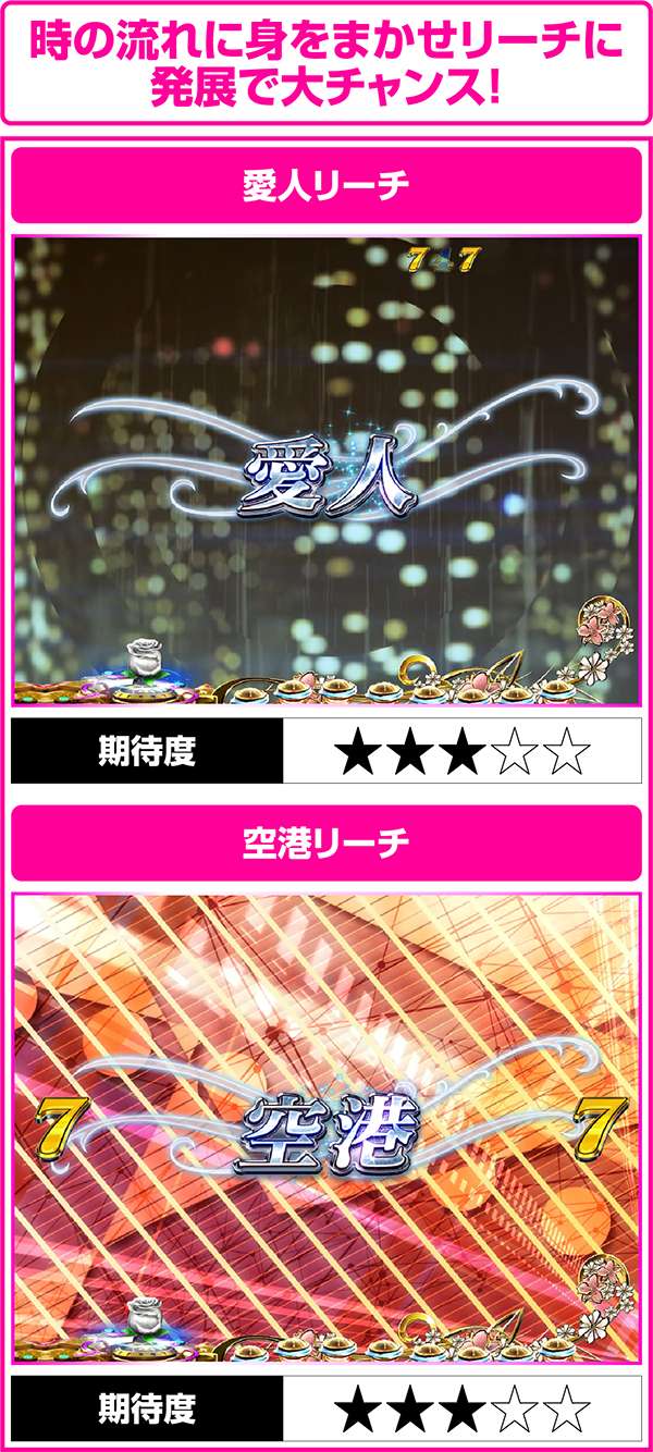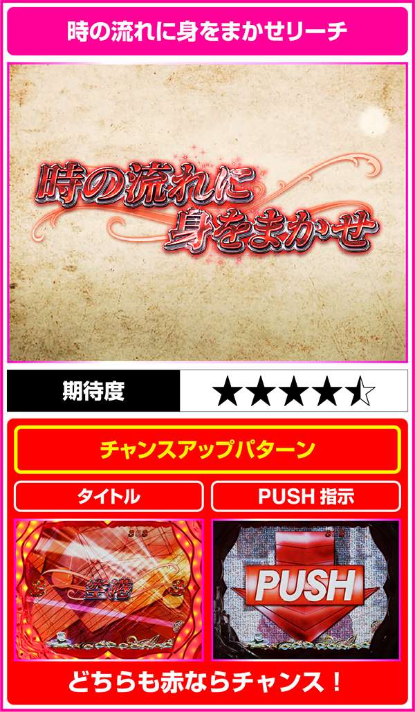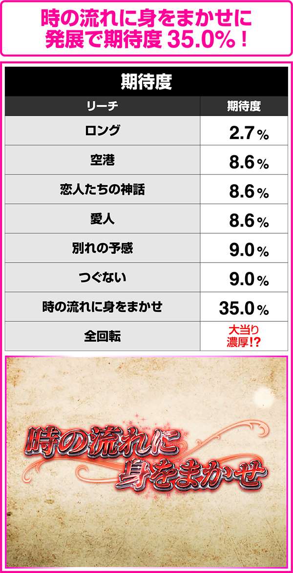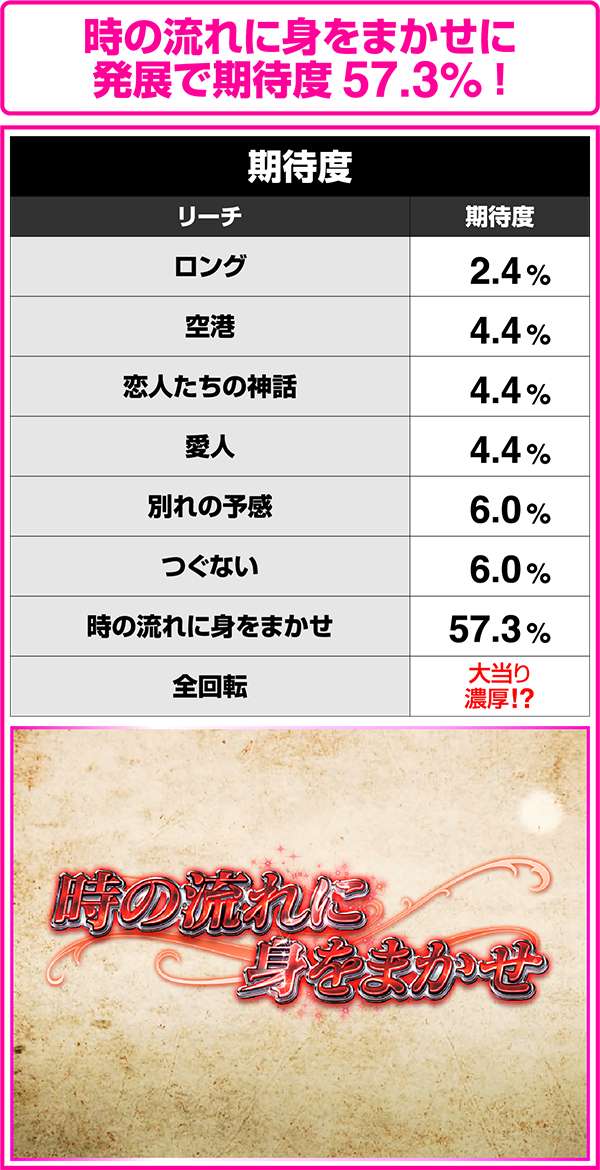 楽曲で展開するスペシャルリーチに発展すればチャンスとなり、時の流れに身をまかせリーチなら激アツ!
