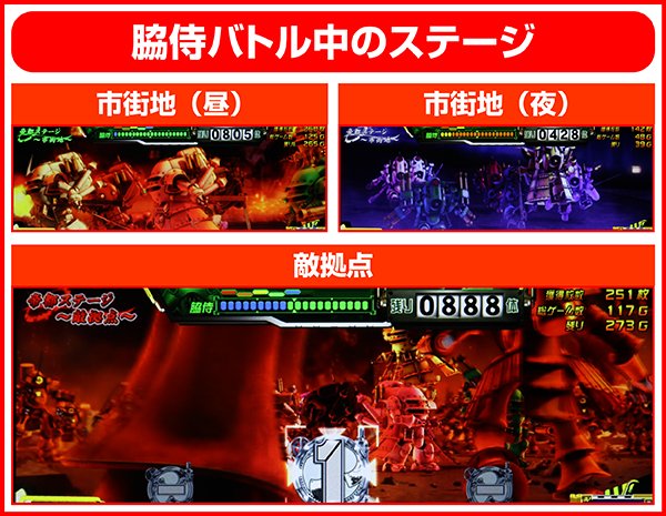 また、脇侍バトル中に脇侍を全撃破すれば敵将バトルが継続以上となるため、脇侍バトル中の撃破がARTの自力継続の鍵といえる。