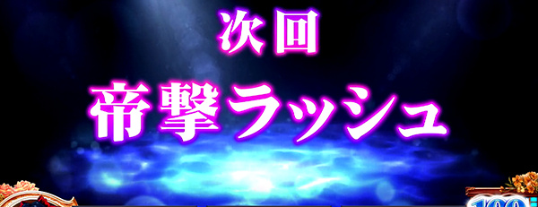 帝撃ラッシュは脇侍バトルと敵将バトルで1セット。脇侍バトルが自力継続タイプ、敵将バトルが継続率による抽選となる。最終的に敵将バトルで継続or勝利すればARTが継続となり、敗北してしまうとART終了となる。