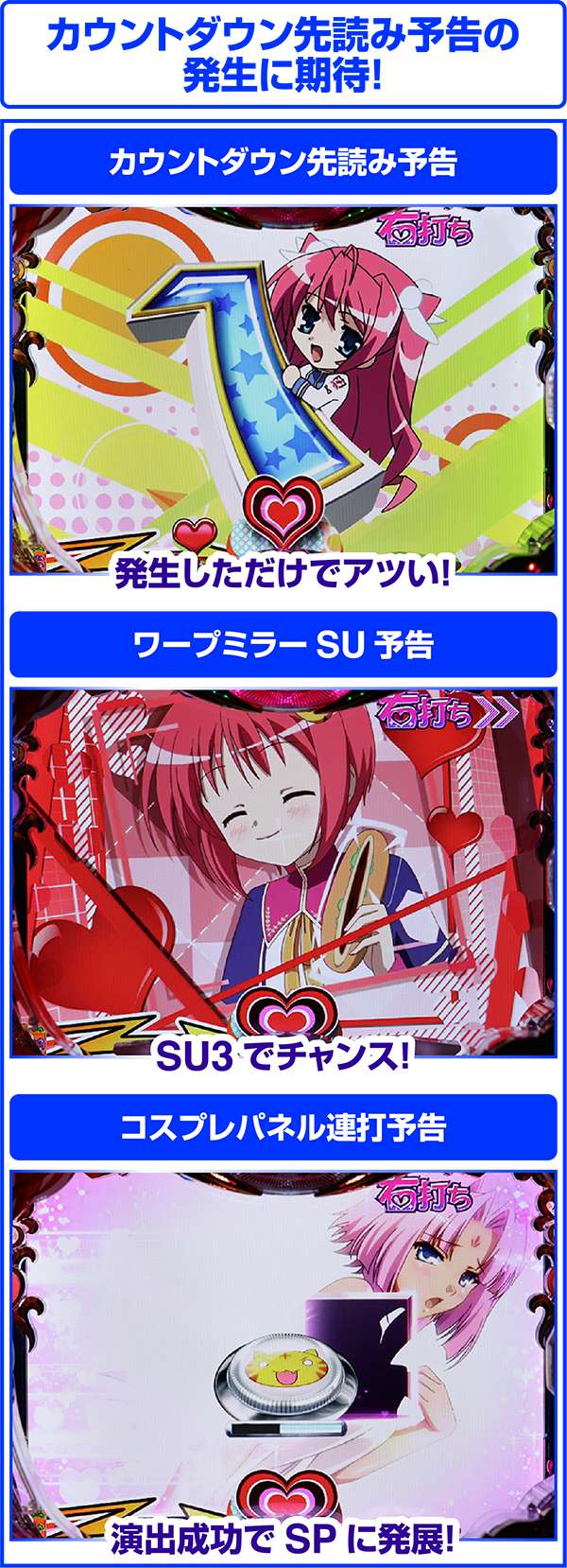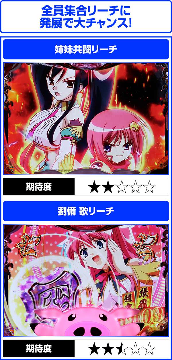 恋姫夢想の名場面で展開される2つのリーチは、SP発展時などで筐体上部のきゅいんパト役モノが落下すれば発展。