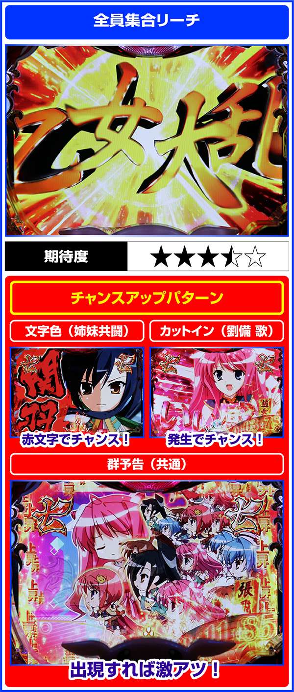 全員集合リーチは弱系や姉妹共闘、劉備 歌リーチ中に上部のハートが連なる役モノが作動すれば発展。