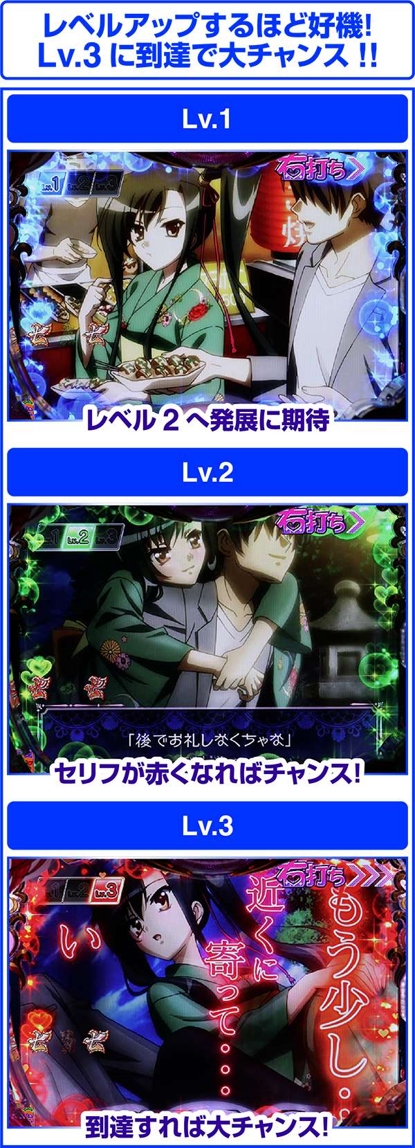 リーチ中にレベルは1段階ずつアップしていき、Lv.3に到達で大チャンス。Lv.2でも大当りのチャンスとなるぞ。
