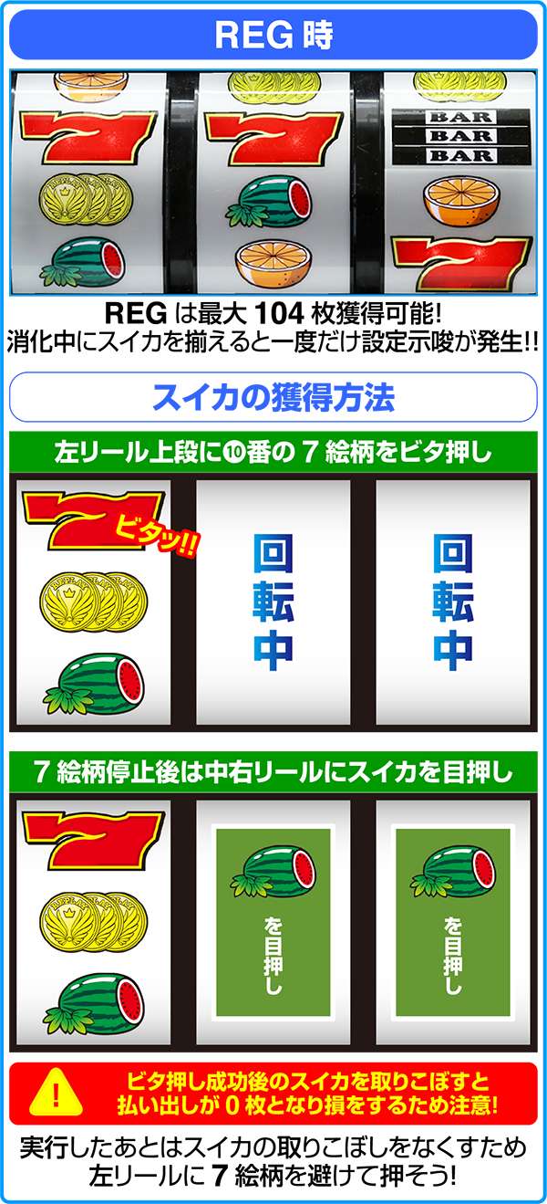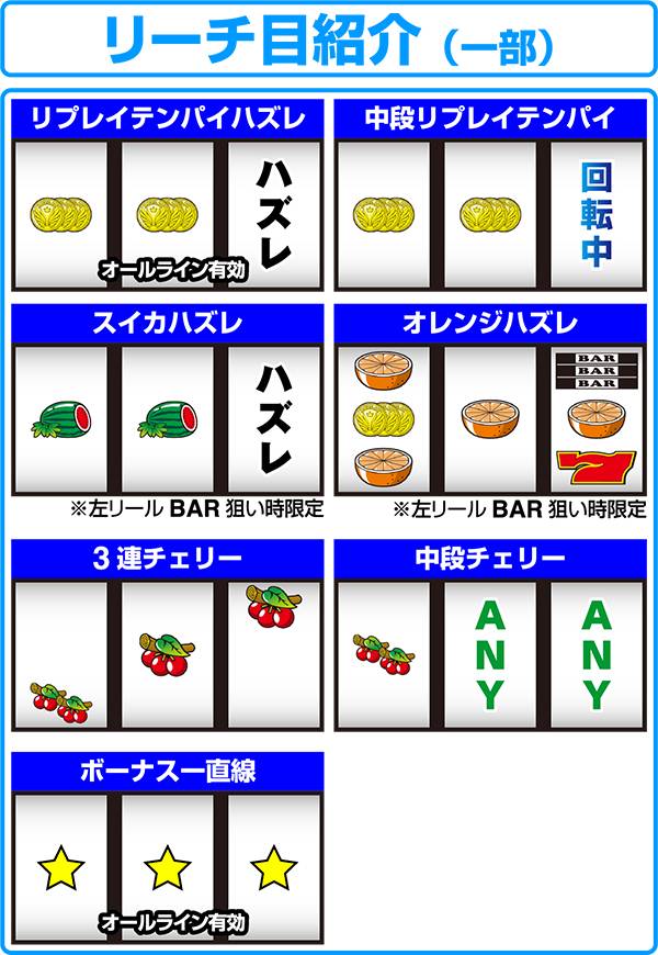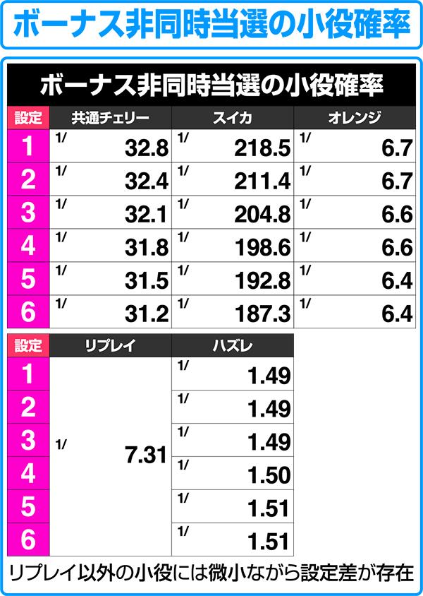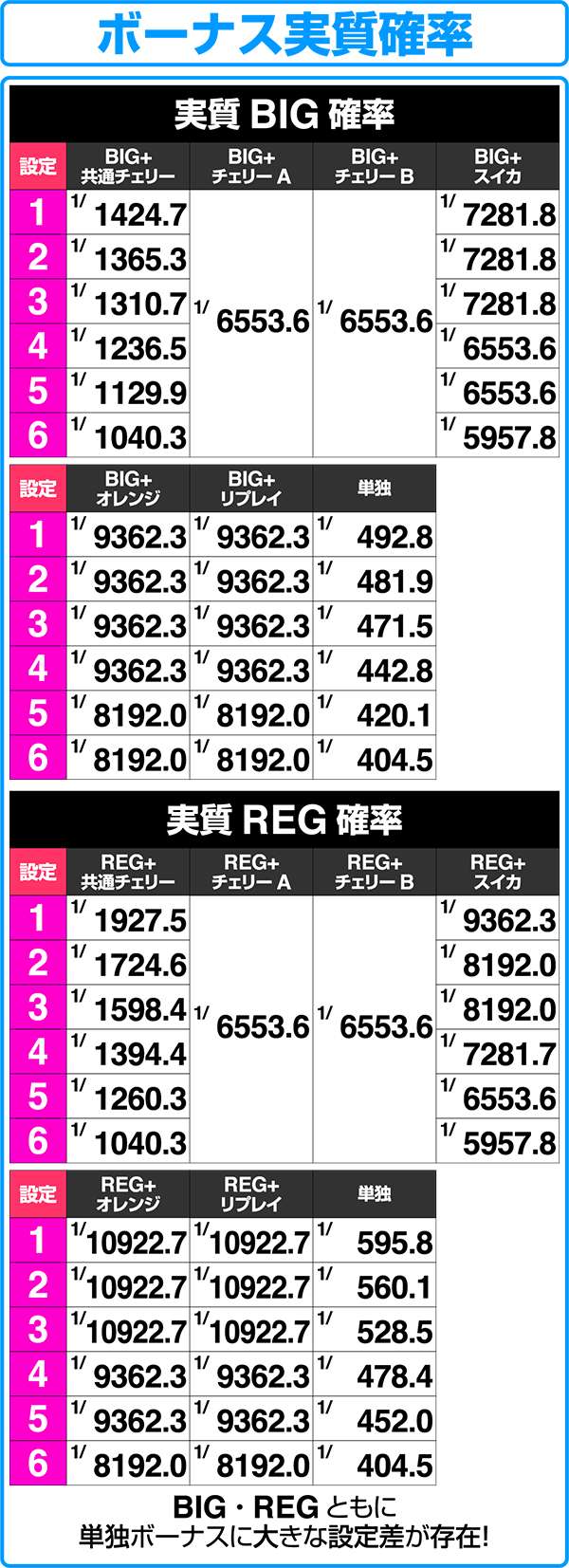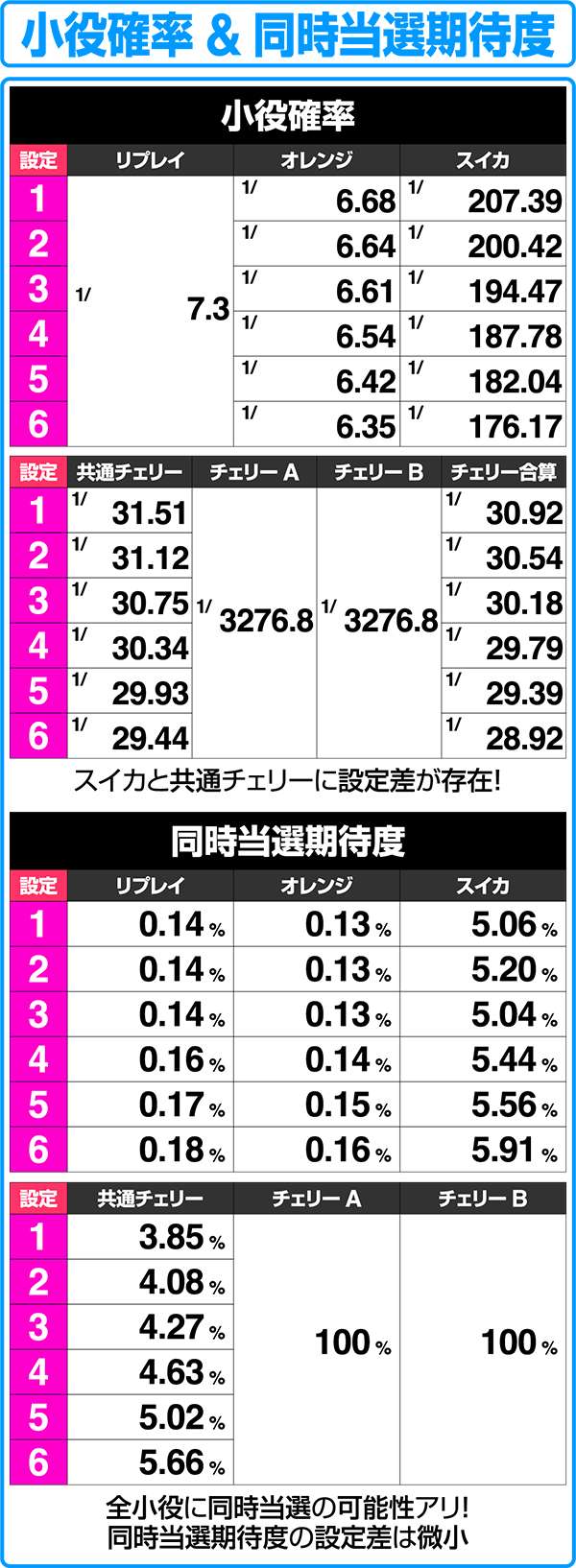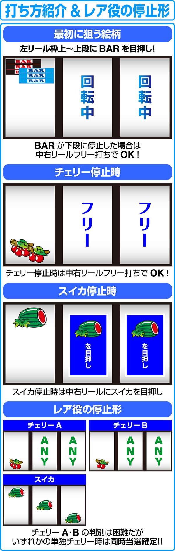 また、チェリーAorB成立時に異なるチェリーを狙っていると取りこぼしてしまうが、どちらも同時当選確定となっている。