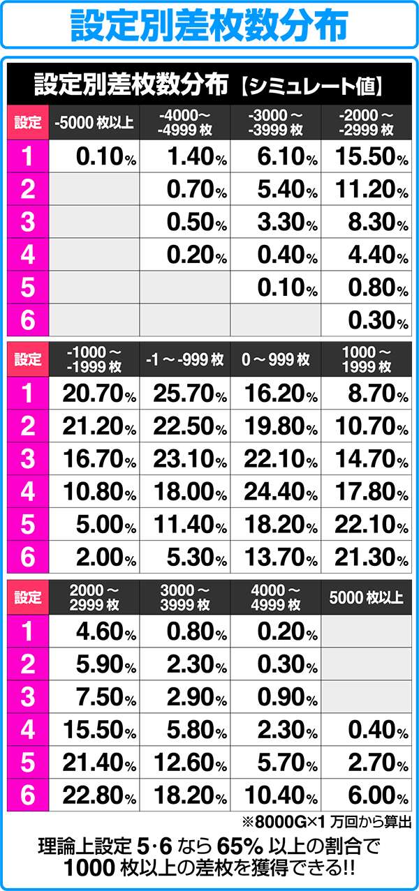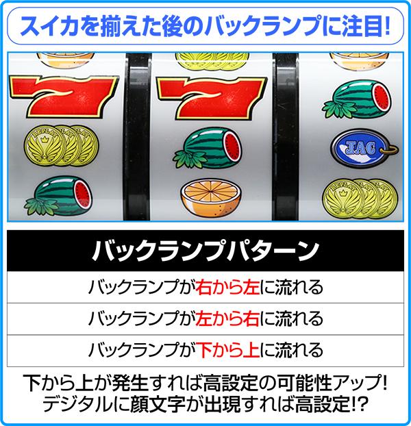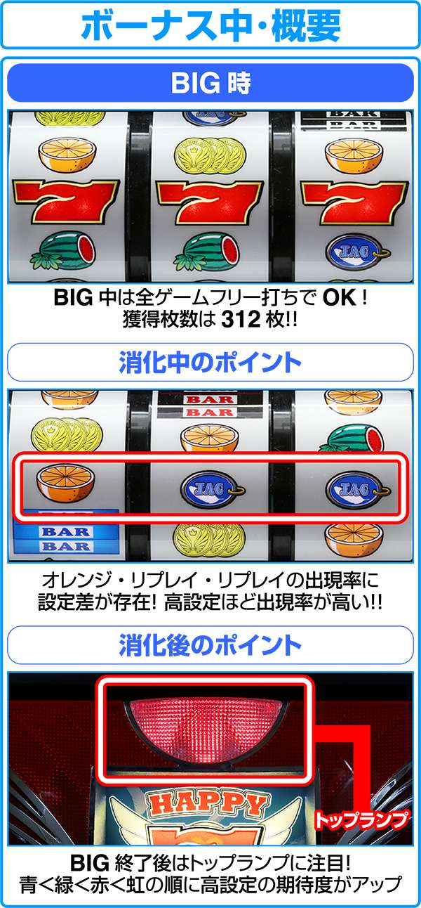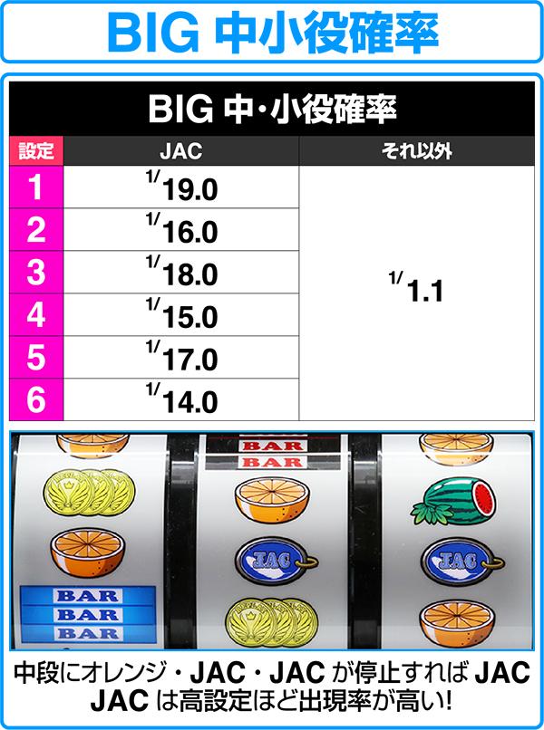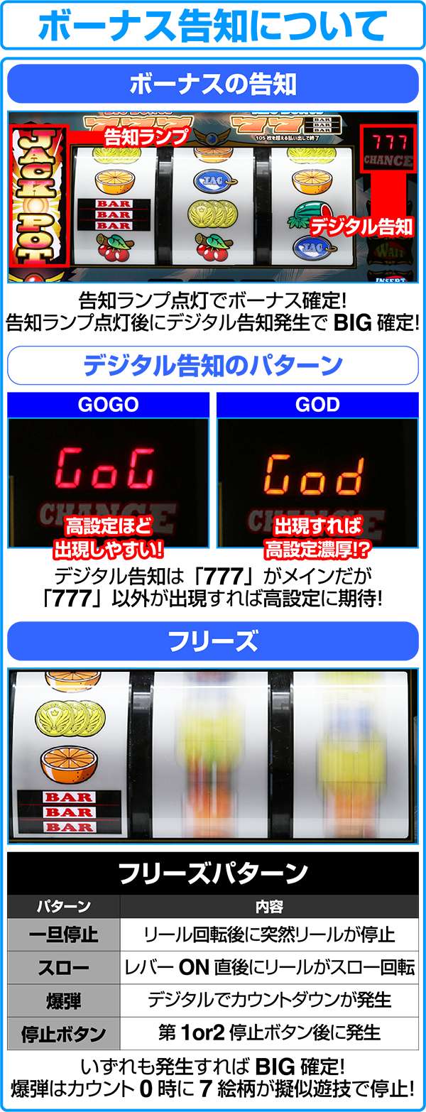 ジャックポットシリーズの魅力であるランプ+7セグによる完全告知を継承し、「ハッピージャックポット」が登場。出玉増加はボーナスのみといったおなじみのボーナスタイプとなっている。BIGは技術介入不要で312枚、REGは最大104枚獲得できる。 また、ボーナス当選時に告知ランプと7セグによるダブル告知が発生すればBIG確定、ボーナス中の設定示唆など、奥深い要素も満載だ。 |