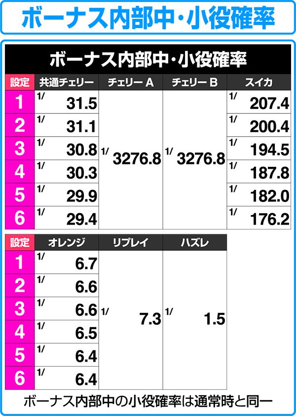 解析情報通常時 > 基本・小役関連 > ボーナス内部中・小役確率を更新しました