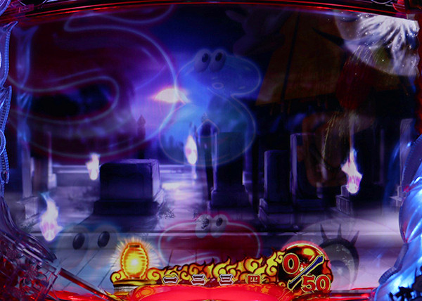 おばけ図柄が中に停止すれば突入。背景は専用のモノに変化し、墓場ならチャンス。