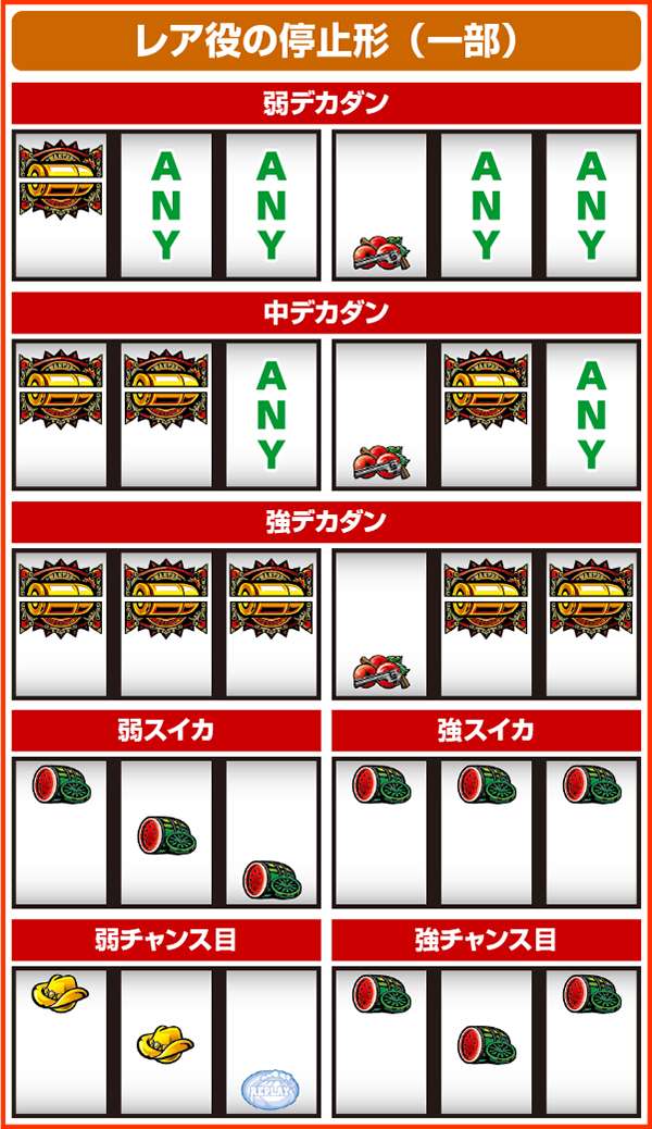 弱デカダン(×2)<弱チャンス目・弱スイカ(×3)<中デカダン(×4)<強チャンス目・強スイカ(×6)<強デカダン(×10)