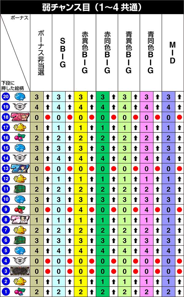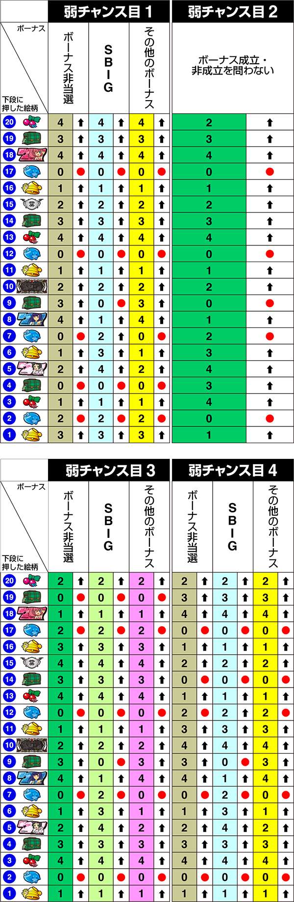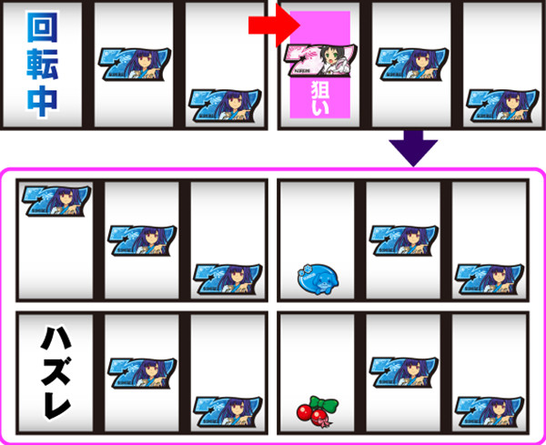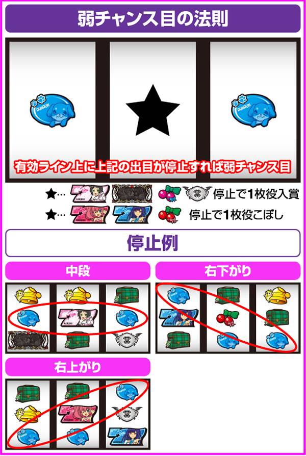 ART中はハズレ確率に設定差があるが、弱チャンス目と間違える可能性があるため、弱チャンス目の停止形をしっかりと頭に入れておこう。