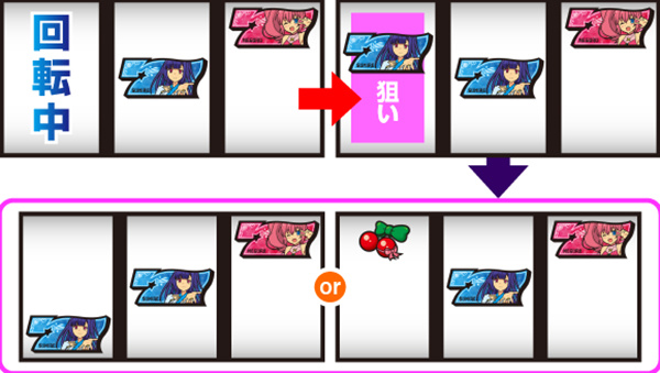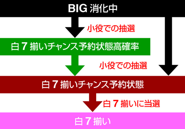 おもにベル小V系のフラグで移行抽選をおこない、1G間で7揃いのフラグを引ければ白7揃い確定。