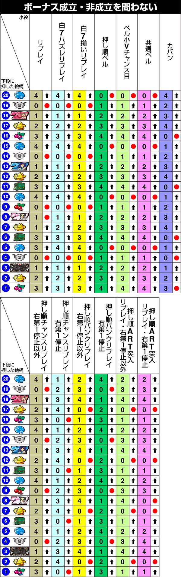 実際のボーナス確率は1/179.1〜1/144.0(設定1〜設定6)だが、完走型のARTを搭載しているため、実際よりも少しだけ低くなる。