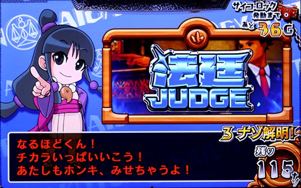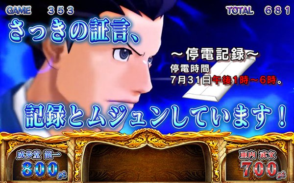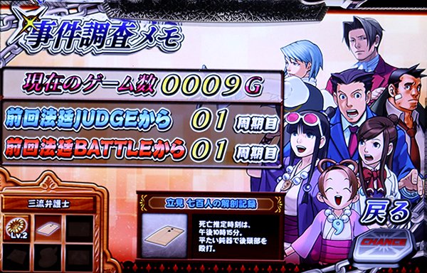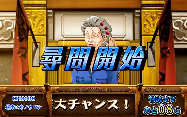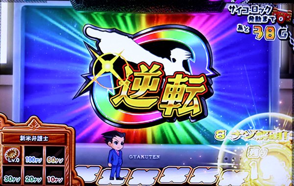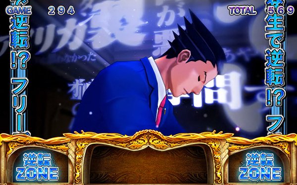 1Gあたりの純増約2.0枚のART機として「パチスロ 逆転裁判」が登場する。 通常時のゲーム性は周期抽選がメインとなっており、40G間に引いた小役で「ナゾポイント」を減らすほどCZ突入期待度がアップし、最終的にCZをクリアできればARTに突入。 ART「法廷バトル」では1セット平均40G、小役で相手検事にダメージを与えるガチバトルタイプとなっているため、プレイヤーのヒキが継続のカギとなる。 |
