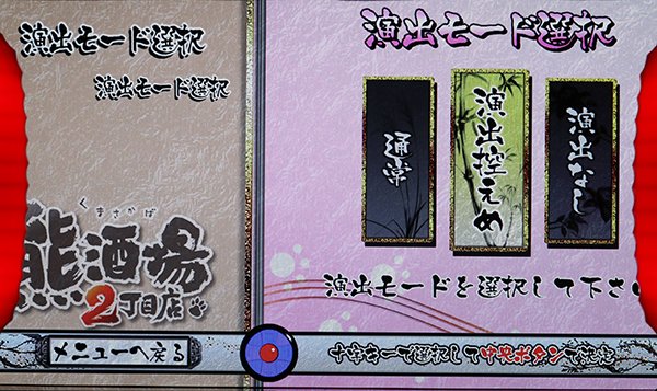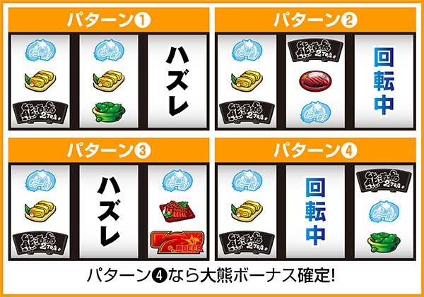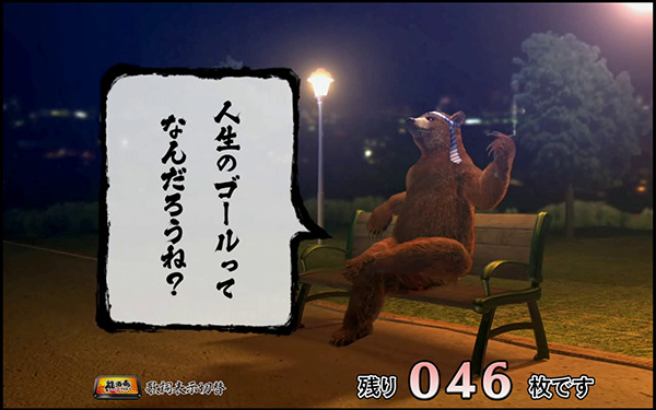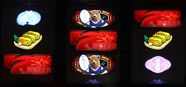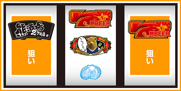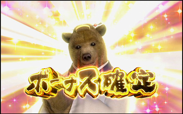 扉が開けばボーナス確定と、おなじみの演出を継承し「熊酒場2丁目店」が開店。 設定6の機械割が119.9%と前作よりもアップしていることも注目のポイント。ボーナスの獲得枚数はBIG(大熊ボーナス)が最大311枚、REG(小熊ボーナス)は最大103枚。もちろん、告知パターンもパワーアップしている。 |