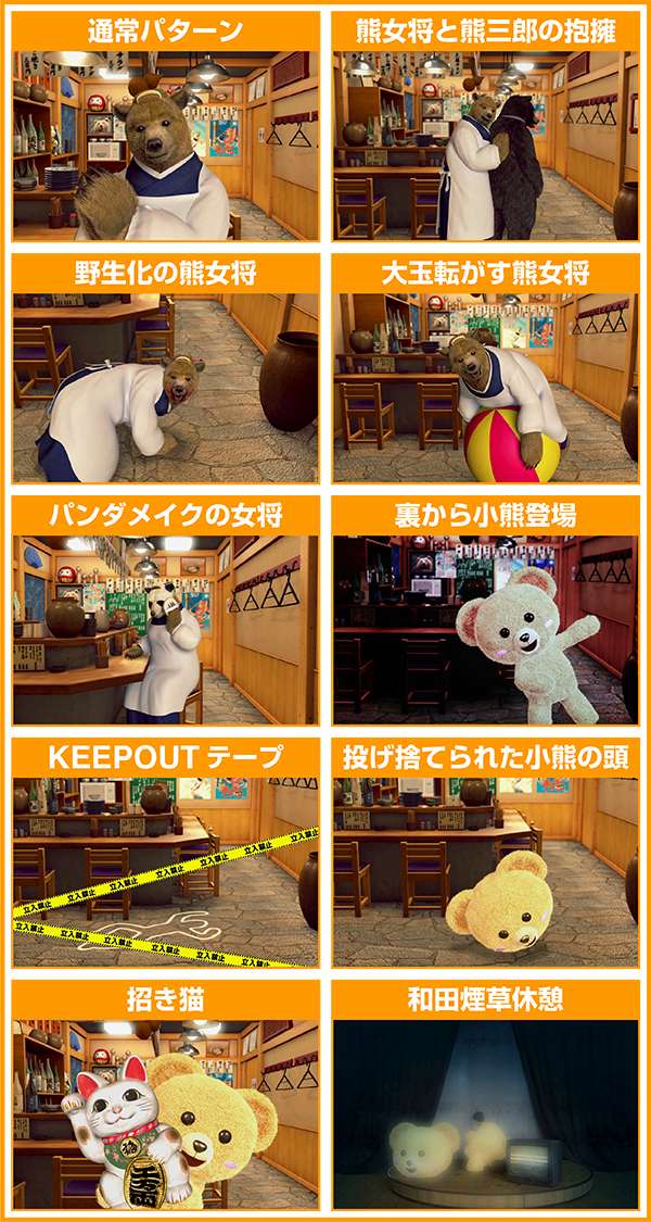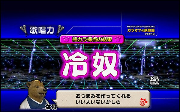 熊カラはボーナス終了後の一部で発生。熊カラの採点結果と一言キャラに応じて設定を示唆する。