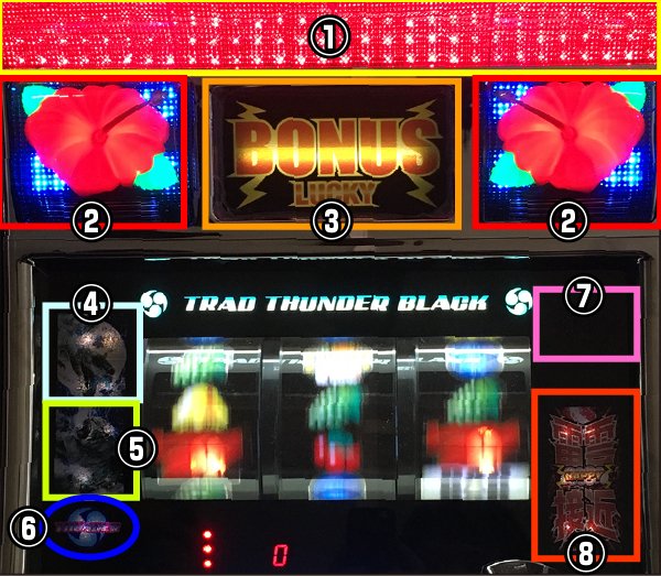 8つの告知ランプと400通り以上の告知パターンというこれまでにないスケールのボーナスタイプとして登場する「トラッドサンダーブラック」。 基本的なゲーム性はこれまでのシリーズと同じく完全告知となっており、ボーナスの種類はBIGとREGの2種類。告知演出が2つ以上複合すればBIG確定となるなど、楽しい法則が多数用意されている。 |