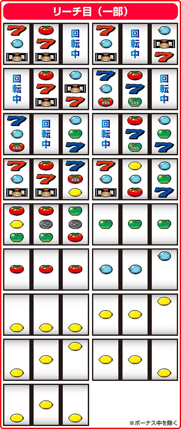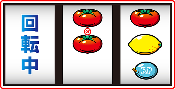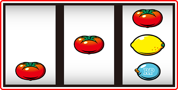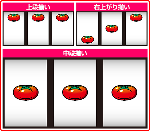 トマトのおもな停止形は上段or右上がり(左リールはBARが代用)。中段トマト揃いはBIG確定。