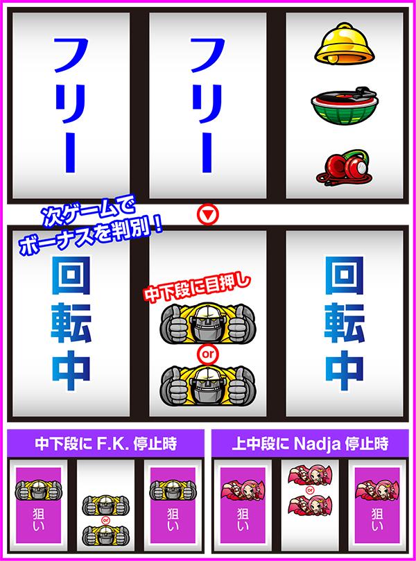 ボーナスはBIGのみで、SIDE-A(同色)とSIDE-B(異色)の2種類。ともに、消化中に技術介入をおこなうことで最大獲得枚数を獲得することができる。また、BIG終了後のRT突入率は60%と、ボーナスとRTをループさせることでの出玉増加にも期待が持てる。