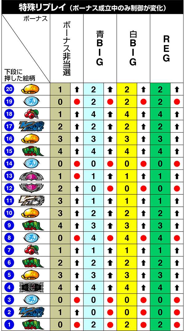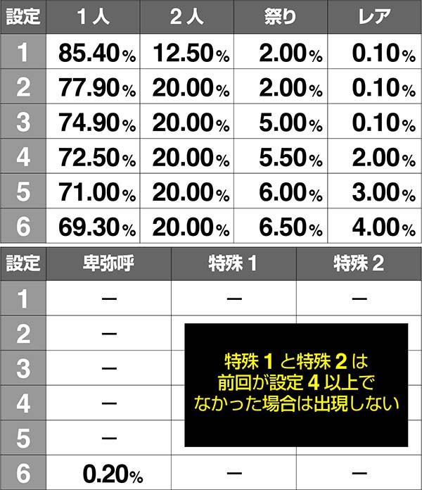 特殊2は前日が設定6の据え置きor設定6から6への打ち替え時にのみ発生。また、前日が設定6だった場合に限り、特殊1も設定6確定となる。