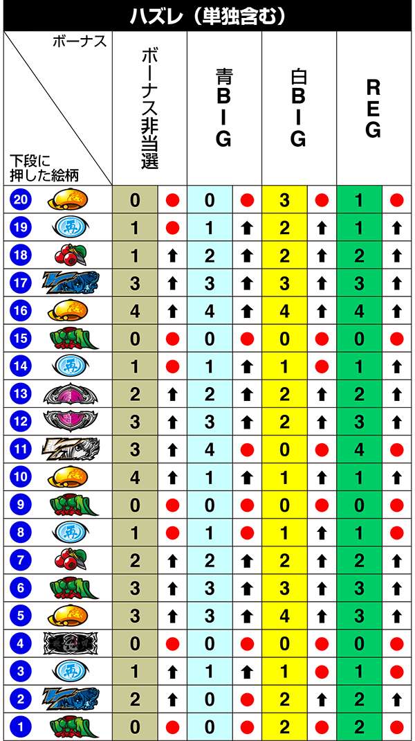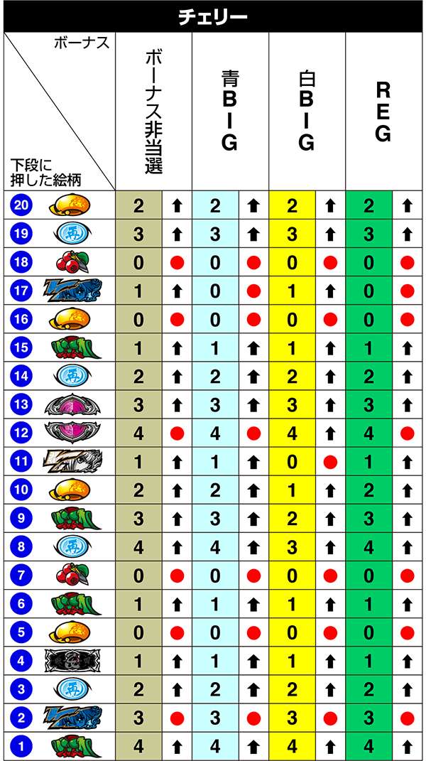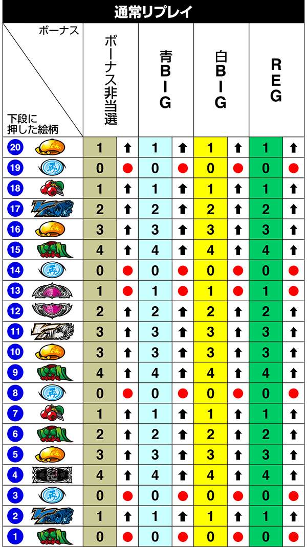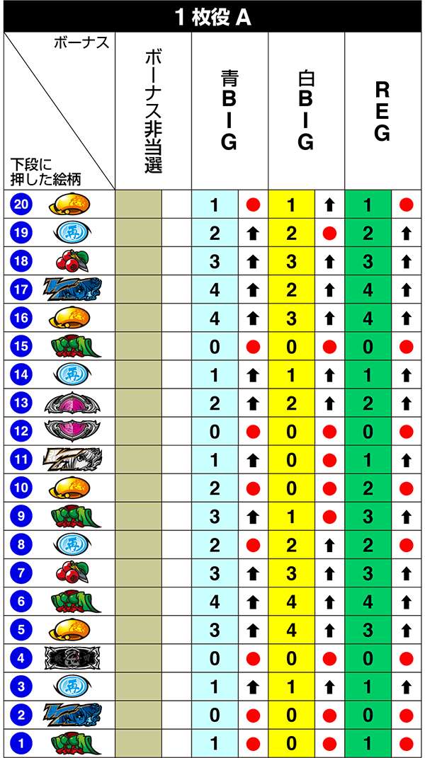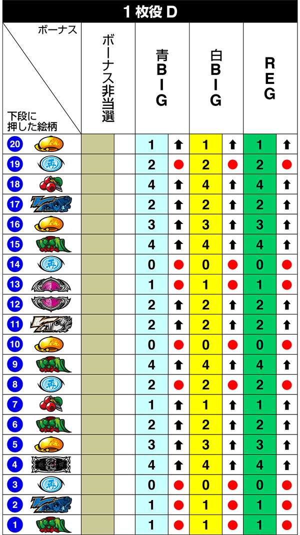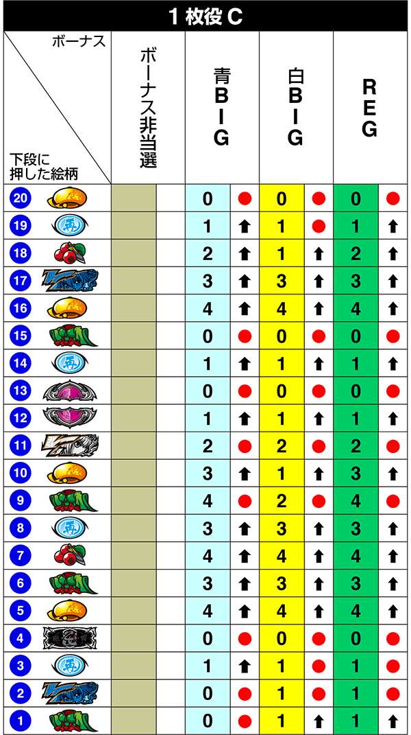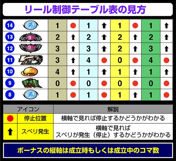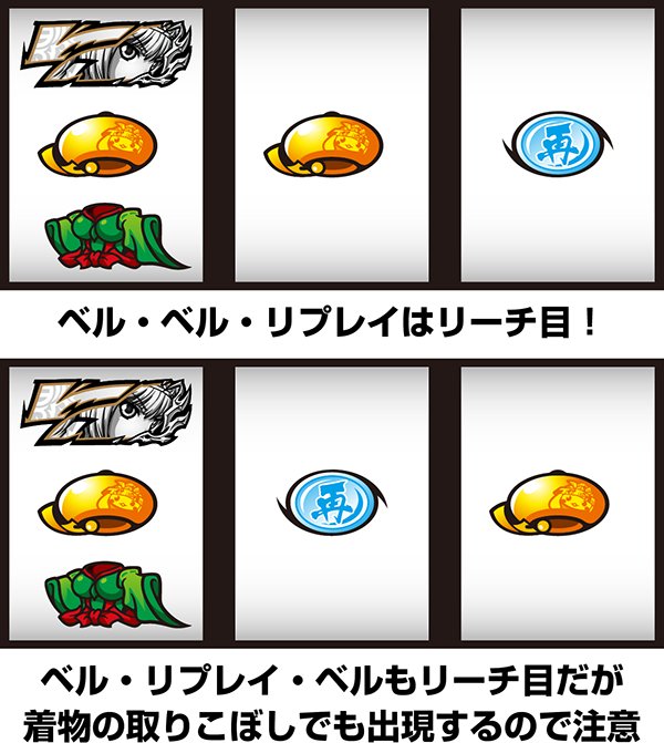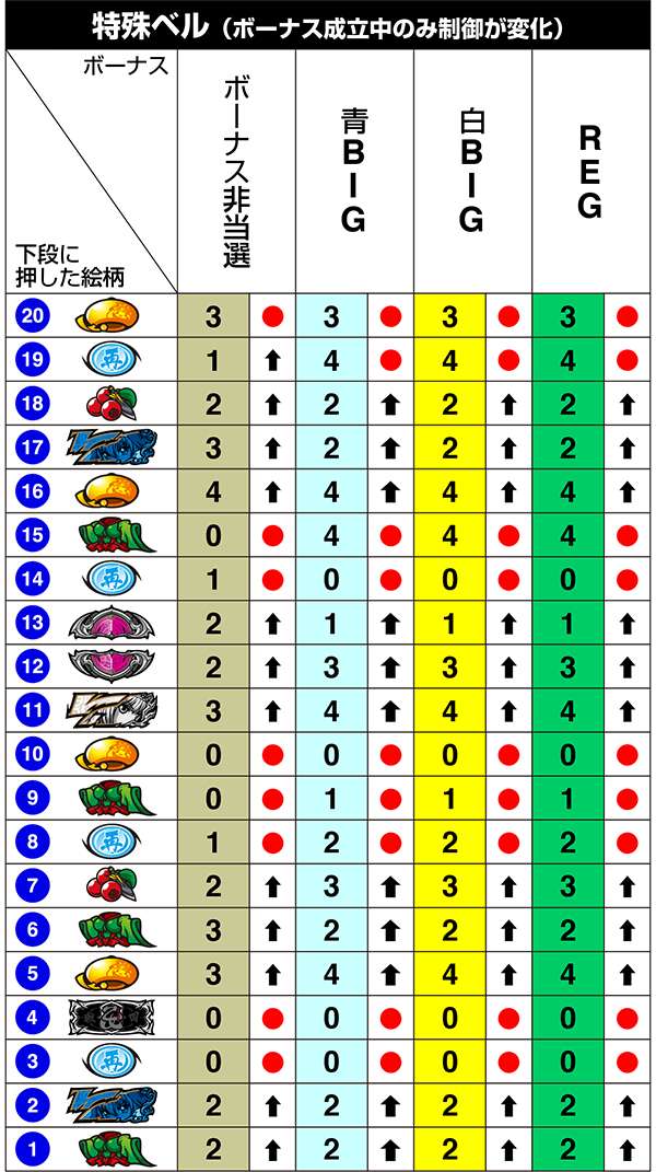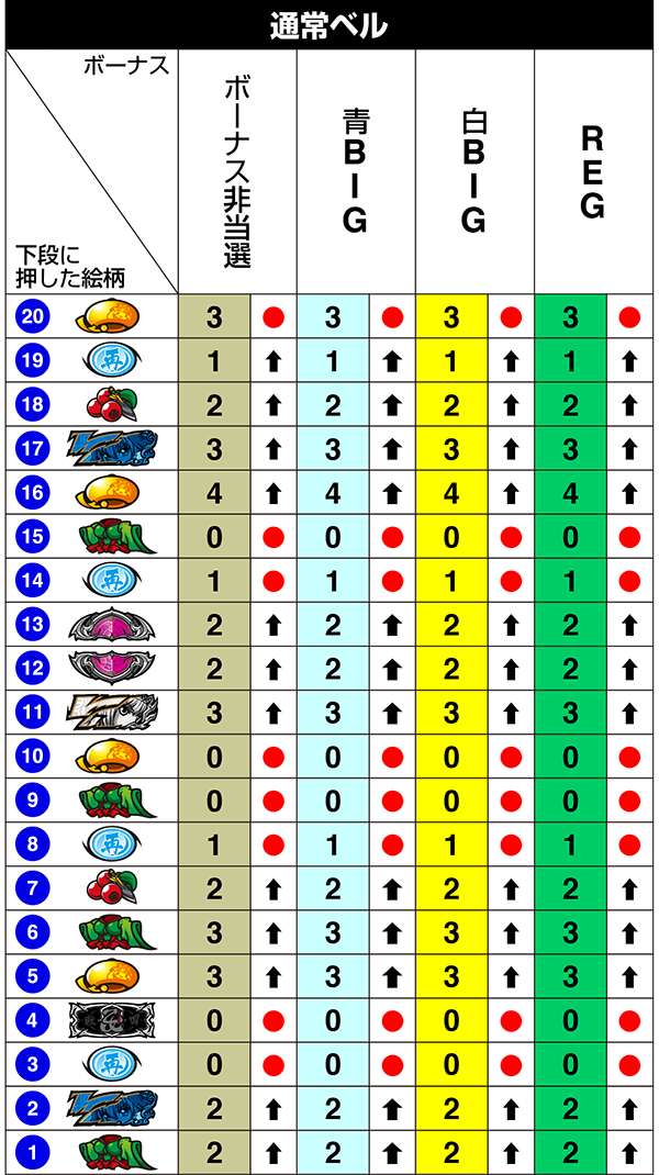 BIG中は一度14枚役をとれば最大獲得枚数をゲットできるわけだが、「技術介入で14枚役にできるベル」の確率は偶数設定が優遇。逆押しでベルが中段にテンパイ=14枚役にできるベルとなる。