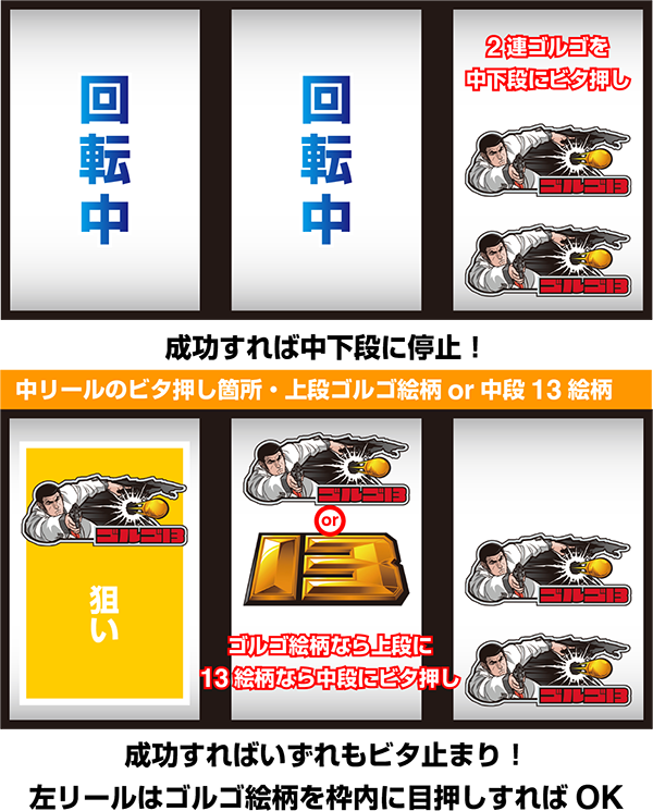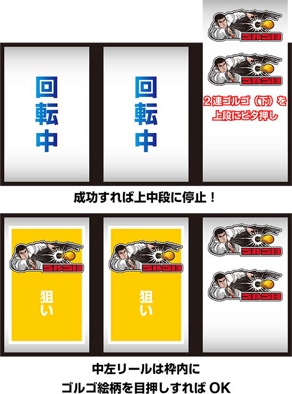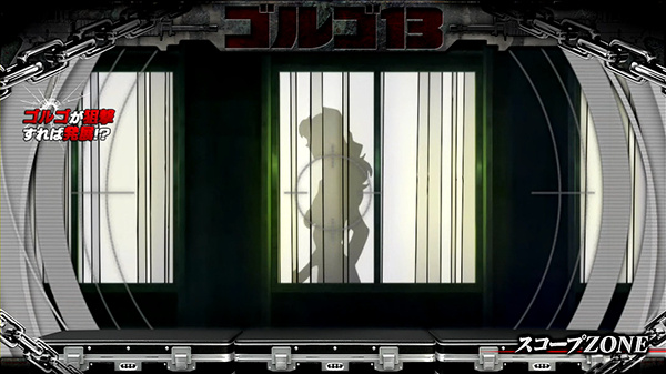 ゴルゴ絵柄揃い(シングルとダブル)は液晶に表示されている弾丸(初期5発)がある限り押し順ナビが発生。シングル揃いなら弾丸を1発消費し、ダブルなら弾丸の消費なし+超A級エクストラスナイプ(ダブル揃い高確)に移行する。
