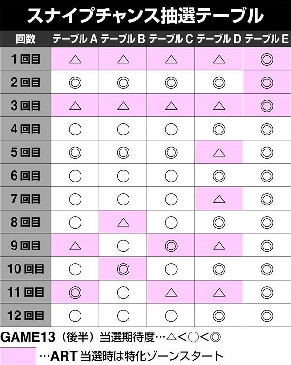 ART中は前半と後半で抽選内容が変化。ART前半(1G~87G)は小役によるCZ or ARTストック、後半(88G〜100G)ならスナイプCHANCE当選率が優遇される。いずれも高確中なら1Gあたり約13分の1で獲得できる。
