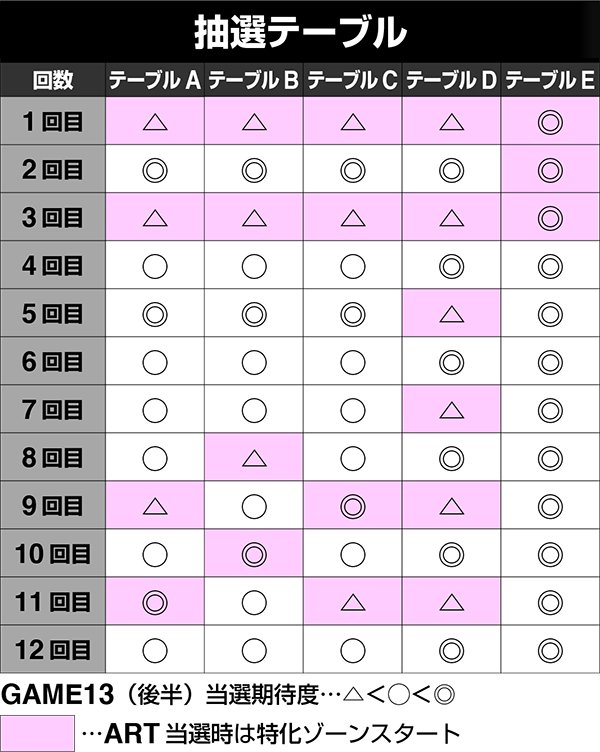 準備中開始から成立役不問で13G毎に13分の1で高確移行を抽選し、ART突入リプレイ成立or13G消化まで継続となる。