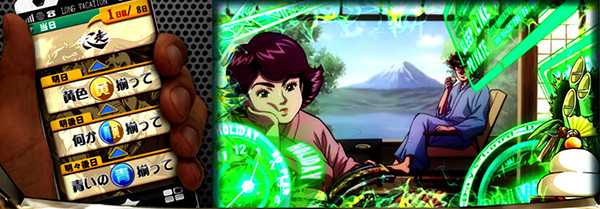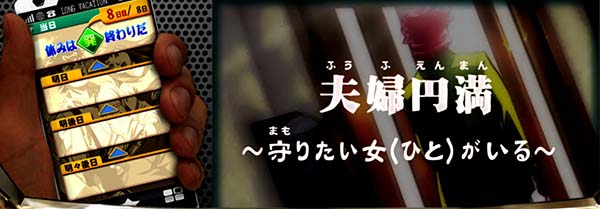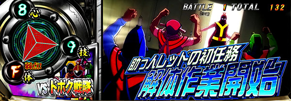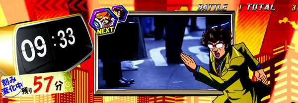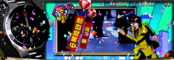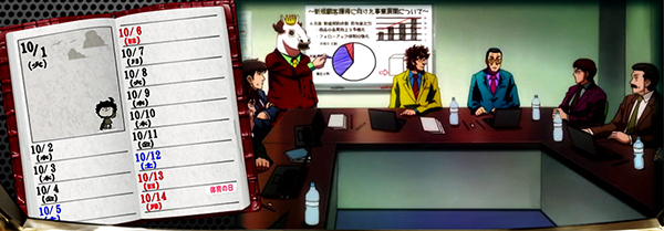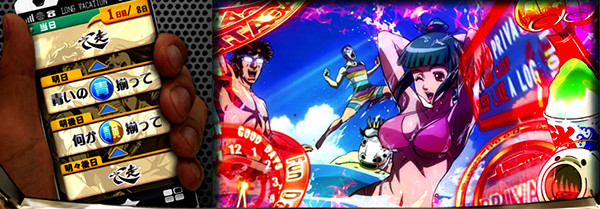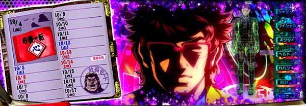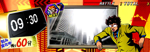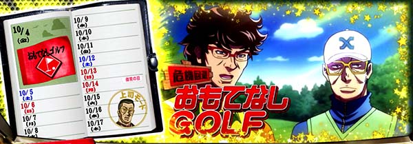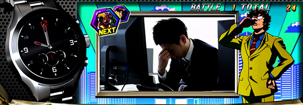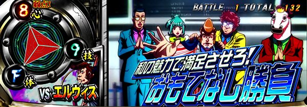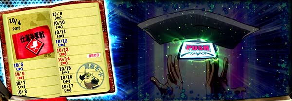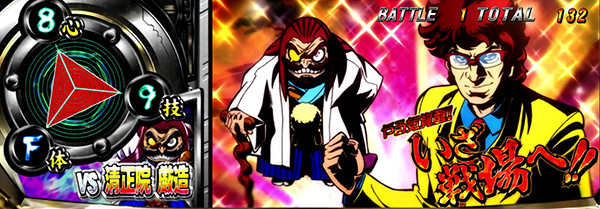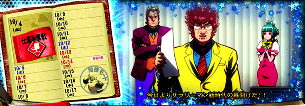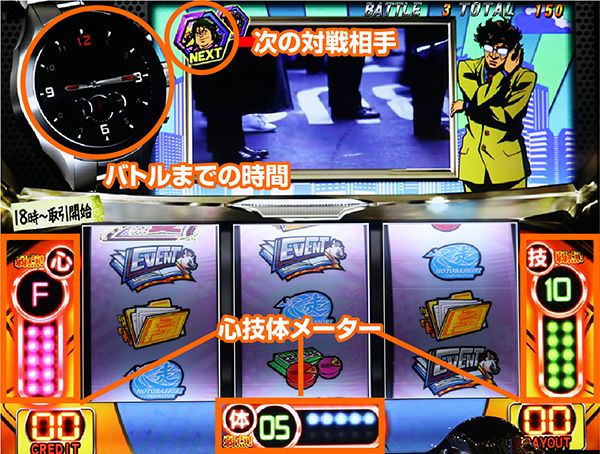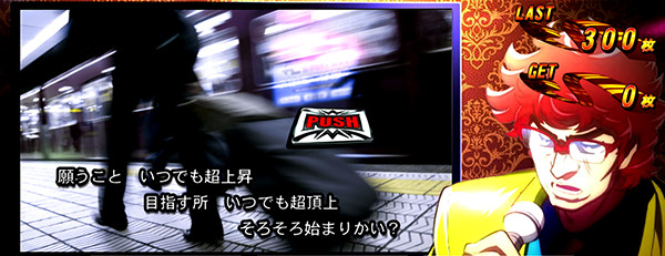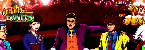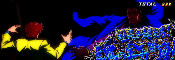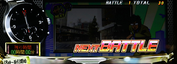 オリジナルコンテンツ「闘え!サラリーマン」が純増約1.7枚/Gのボーナス+ART機で登場。 通常時は1枚役orリプレイである「イベント図柄」を揃えるとART突入のチャンスである「ステップ」が発生するゲーム性だ。 ART「通勤RUSH」は1G=約15分の時間管理型で、本編パートとバトルパートをループさせながら継続させていく流れ。最終的に社長バトルに勝利すれば特化ゾーン「帰省RUSH」に突入する。 |
