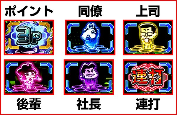 キャラモード移行率(設定1〜設定6)同僚モード…66.02%〜45.31%、上司モード…20.31%〜25.00%、後輩モード…10.16%〜18.75%、嫁モード…3.13%〜7.81%、社長モード…0.39%〜3.13%。