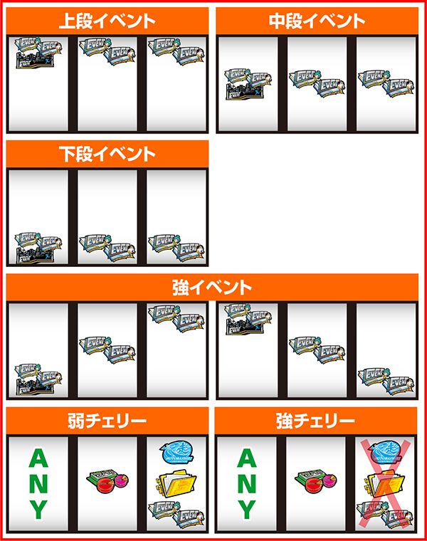 ハズレ<上or中段イベント=弱チェリー<下段イベント<強チェリー<強イベント