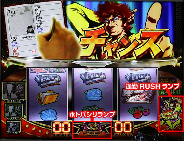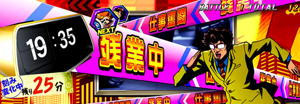 残業終了後は、継続バトル発展前に通勤RUSHを1G経由するため、ここでイベント揃いやレア役を引ければ残業がループする可能性もある。