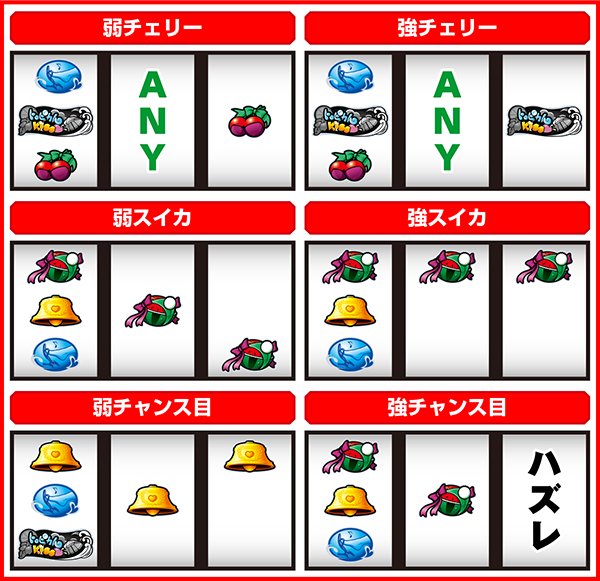 通常時は基本的にスイカ出現時のみ中・右を目押しすれば取りこぼしはないが、チェリーの強弱を見極めるためチェリー停止時は右リールに7orBARを目押ししよう(右中段に7orBAR停止で強チェリー)。